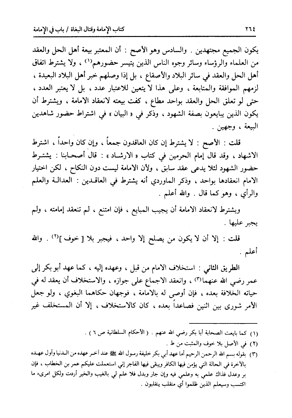 يكون الجميع مجتهدين، والسادس وهو الاصح: أن المعتبر بيعة أهل الحل والعقد من العلماء والرؤساء وسائر وجوه الناس الذين يتيسر حضورهم، ولا يشترط اتفاق أهل الحل والعقد في سائر البلاد والاصقاع، بل إذا وصلهم خبر أهل البلاد البعيدة، لزمهم الموافقة والمتابعة، وعلى هذا لا يتعين للاعتبار عدد، بل لا يعتبر العدد، حتى لو تعلق الحل والعقد بواحد مطاع، كفت بيعته لانعقاد الامامة، ويشترط أن يكون الذين يبايعون بصفة الشهود، وذكر في البيان في اشتراط حضور شاهدين البيعة، وجهين. قلت: الاصح: لا يشترط إن كان العاقدون جمعا، وإن كان واحدا، اشترط الاشهاد، وقد قال إمام الحرمين في كتابه الارشاد: قال أصحابنا: يشترط حضور الشهود لئلا يدعى عقد سابق، ولان الامامة ليست دون النكاح، لكن اختيار الامام انعقادها بواحد، وذكر الماوردي أنه يشترط في العاقدين: العدالة والعلم والرأي، وهو كما قال. والله أعلم. ويشترط لانعقاد الامامة أن يجيب المبايع، فإن امتنع، لم تنعقد إمامته، ولم يجبر عليها. قلت: إلا أن لا يكون من يصلح إلا واحد، فيجبر بلا خوف. والله أعلم. الطريق الثاني: استخلاف الامام من قبل، وعهده إليه، كما عهد أبو بكر إلى عمر رضي الله عنهما، وانعقد الاجماع على جوازه، والاستخلاف أن يعقد له في حياته الخلافة بعده، فإن أوصى له بالامامة، فوجهان حكاهما البغوي، ولو جعل الامر شورى بين اثنين فصاعدا بعده، كان كالاستخلاف، إلا أن المستخلف غير