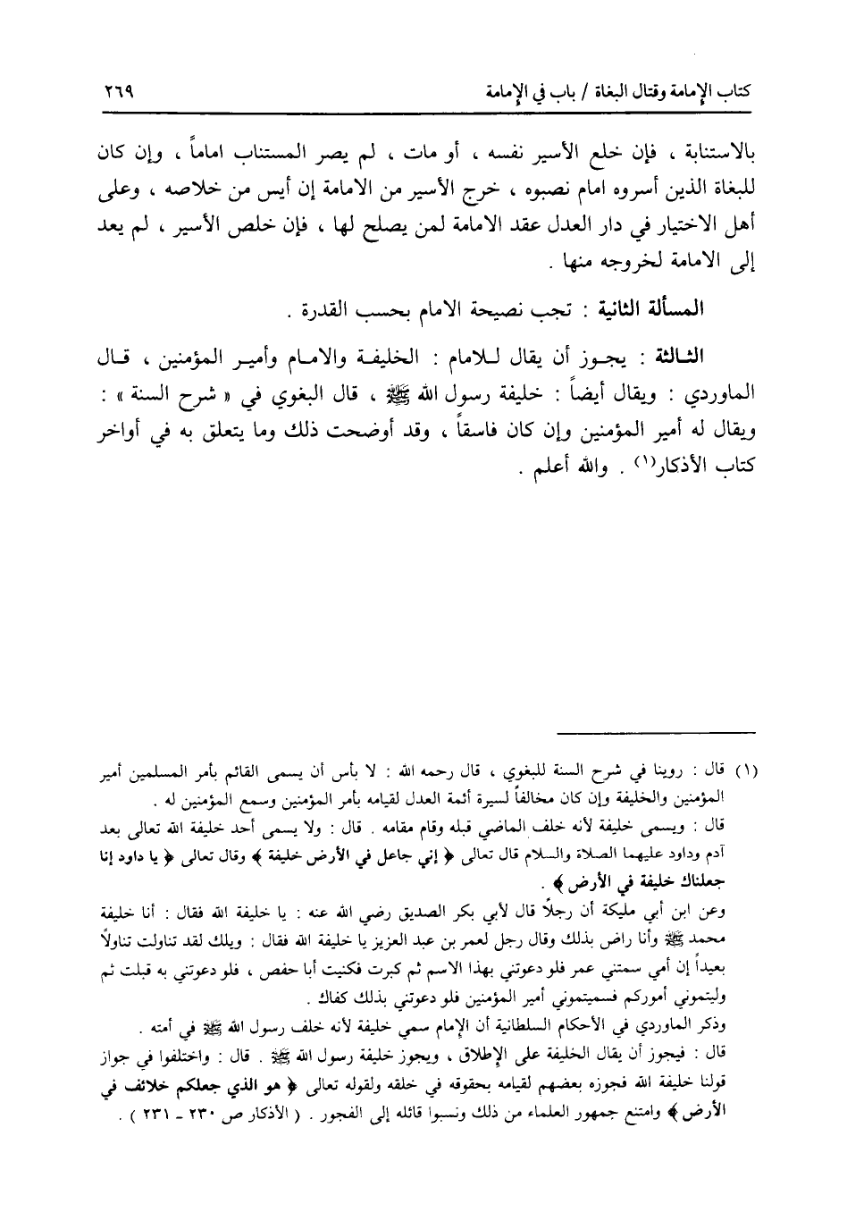 بالاستنابة، فإن خلع الاسير نفسه، أو مات، لم يصر المستناب إماما، وإن كان للبغاة الذين أسروه إمام نصبوه، خرج الاسير من الامامة إن أيس من خلاصه، وعلى أهل الاختيار في دار العدل عقد الامامة لمن يصلح لها، فإن خلص الاسير، لم يعد إلى الامامة لخروجه منها. المسألة الثانية: تجب نصيحة الامام بحسب القدرة. الثالثة: يجوز أن يقال للامام: الخليفة والامام وأمير المؤمنين، قال الماوردي: ويقال أيضا: خليفة رسول الله - صلى الله عليه وسلم -، قال البغوي في شرح السنة: ويقال له أمير المؤمنين وإن كان فاسقا، وقد أوضحت ذلك وما يتعلق به في أواخر كتاب الاذكار. والله أعلم