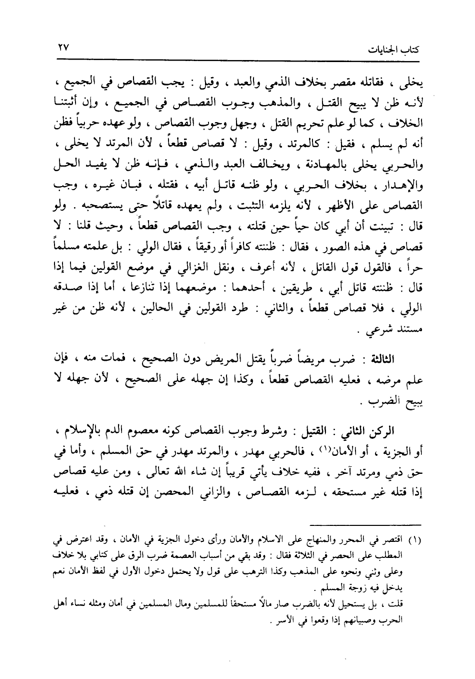 يخلى، فقاتله مقصر بخلاف الذمي والعبد، وقيل: يجب القصاص في الجميع، لانه ظن لا يبيح القتل، والمذهب وجوب القصاص في الجميع، وإن أثبتنا الخلاف، كما لو علم تحريم القتل، وجهل وجوب القصاص، ولو عهده حربيا فظن أنه لم يسلم، فقيل: كالمرتد، وقيل: لا قصاص قطعا، لان المرتد لا يخلى، والحربي يخلى بالمهادنة، ويخالف العبد والذمي، فإنه ظن لا يفيد الحل والاهدار، بخلاف الحربي، ولو ظنه قاتل أبيه، فقتله، فبان غيره، وجب القصاص على الاظهر، لانه يلزمه التثبت، ولم يعهده قاتلا حتى يستصحبه، ولو قال: تبينت أن أبي كان حيا حين قتلته، وجب القصاص قطعا، وحيث قلنا: لا قصاص في هذه الصور، فقال: ظننته كافرا أو رقيقا، فقال الولي: بل علمته مسلما حرا، فالقول قول القاتل، لانه أعرف، ونقل الغزالي في موضع القولين فيما إذا قال: ظننته قاتل أبي، طريقين، أحدهما: موضعهما إذا تنازعا، أما إذا صدقه الولي، فلا قصاص قطعا، والثاني: طرد القولين في الحالين، لانه ظن من غير مستند شرعي. الثالثة: ضرب مريضا ضربا يقتل المريض دون الصحيح، فمات منه، فإن علم مرضه، فعليه القصاص قطعا، وكذا إن جهله على الصحيح، لان جهله لا يبيح الضرب. الركن الثاني: القتيل. وشرط وجوب القصاص كونه معصوم الدم بالاسلام، أو الجزية، أو الامان، فالحربي مهدر، والمرتد مهدر في حق المسلم، وأما في حق ذمي ومرتد آخر، ففيه خلاف يأتي قريبا إن شاء الله تعالى، ومن عليه قصاص إذا قتله غير مستحقه، لزمه القصاص، والزاني المحصن إن قتله ذمي، فعليه