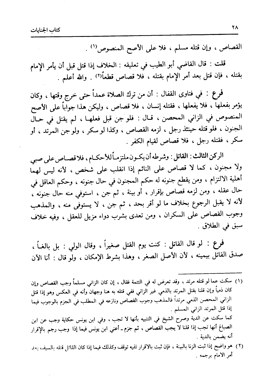 القصاص، وإن قتله مسلم، فلا على الاصح المنصوص. قلت: قال القاضي أبو الطيب في تعليقه: الخلاف إذا قتل قبل أن يأمر الامام بقتله، فإن قتل بعد أمر الامام بقتله، فلا قصاص قطعا. والله أعلم. فرع في فتاوى القفال: أن من ترك الصلاة عمدا حتى خرج وقتها، وكان يؤمر بفعلها، فلا يفعلها، فقتله إنسان، فلا قصاص، وليكن هذا جوابا على الاصح المنصوص في الزاني المحصن، قال: فلو جن قبل فعلها، لم يقتل في حال الجنون، فلو قتله حينئذ رجل، لزمه القصاص، وكذا لو سكر، ولو جن المرتد، أو سكر، فقتله رجل، فلا قصاص لقيام الكفر. الركن الثالث: القاتل. وشرطه أن يكون ملتزما للاحكام، فلا قصاص على صبي ولا مجنون، كما لا قصاص على النائم إذا انقلب على شخص، لانه ليس لهما أهلية الالتزام، ومن يقطع جنونه له حكم المجنون في حال جنونه، وحكم العاقل في حال عقله، ومن لزمه قصاص بإقرار، أو بينة، ثم جن، استوفي منه حال جنونه، لانه لا يقبل الرجوع بخلاف ما لو أقر بحد، ثم جن، لا يستوفى منه، والمذهب وجوب القصاص على السكران، ومن تعدى بشرب دواء مزيل للعقل، وفيه خلاف سبق في الطلاق. فرع لو قال القاتل: كنت يوم القتل صغيرا، وقال الولي: بل بالغا، صدق القاتل بيمينه، لان الاصل الصغر، وهذا بشرط الامكان، ولو قال: أنا الآن