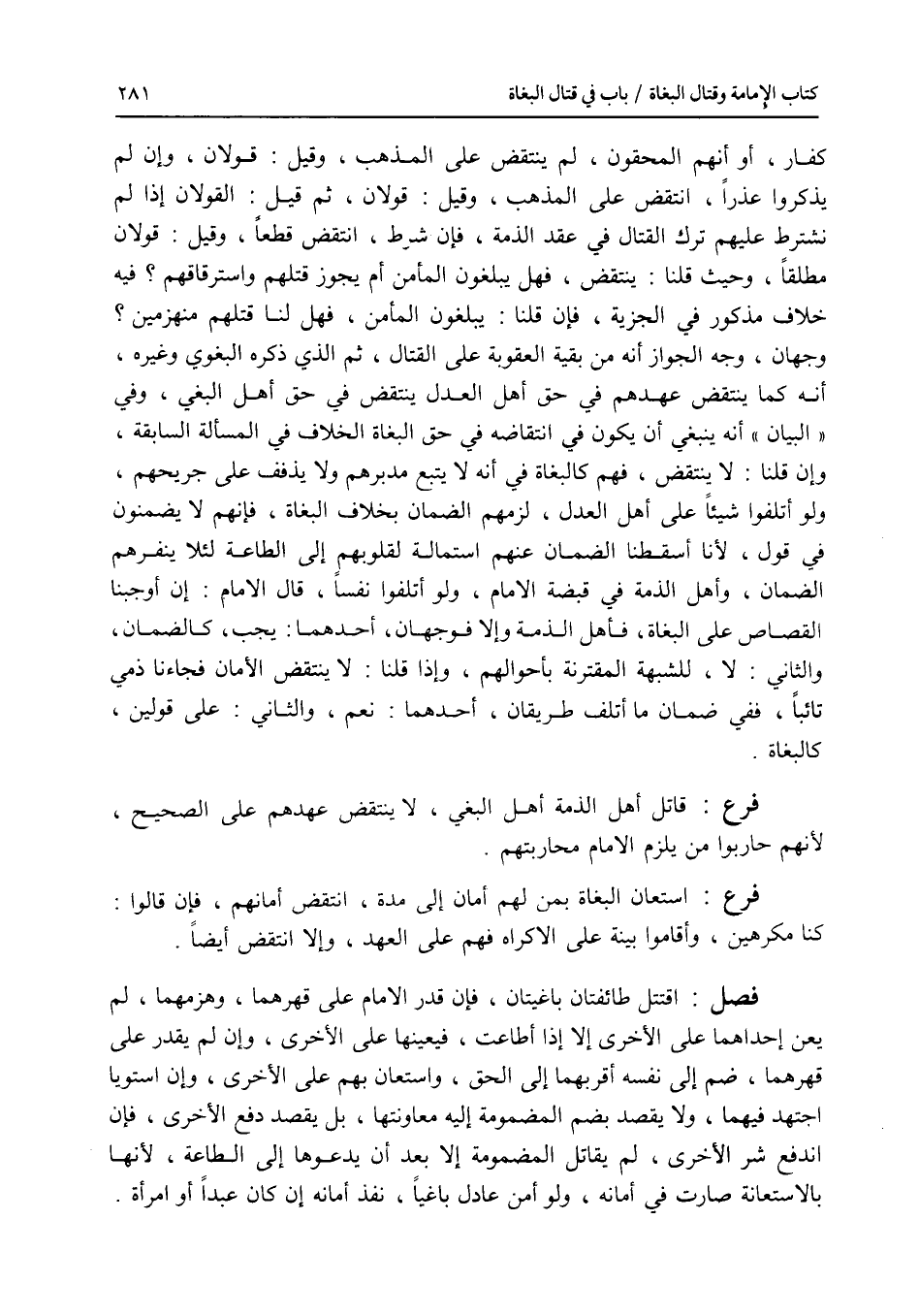كفار، أو أنهم المحقون، لم ينتقض على المذهب، وقيل: قولان، وإن لم يذكروا عذرا، انتقض على المذهب، وقيل: قولان، ثم قيل: القولان إذا لم نشترط عليهم ترك القتال في عقد الذمة، فإن شرط، انتقض قطعا، وقيل: قولان مطلقا، وحيث قلنا: ينتقض، فهل يبلغون المأمن أم يجوز قتلهم واسترقاقهم ؟ فيه خلاف مذكور في الجزية، فإن قلنا: يبلغون المأمن، فهل لنا قتلهم منهزمين ؟ وجهان، وجه الجواز أنه من بقية العقوبة على القتال، ثم الذي ذكره البغوي وغيره، أنه كما ينتقض عهدهم في حق أهل العدل ينتقض في حق أهل البغي، وفي البيان أنه ينبغي أن يكون في انتقاضه في حق البغاة الخلاف في المسألة السابقة، وإن قلنا: لا ينتقض، فهم كالبغاة في أنه لا يتبع مدبرهم ولا يذفف على جريحهم، ولو أتلفوا شيئا على أهل العدل، لزمهم الضمان بخلاف البغاة، فإنهم لا يضمنون في قول، لانا أسقطنا الضمان عنهم استمالة لقلوبهم إلى الطاعة لئلا ينفرهم الضمان، وأهل الذمة في قبضة الامام، ولو أتلفوا نفسا، قال الامام: إن أوجبنا القصاص على البغاة، فأهل الذمة وإلا فوجهان، أحدهما: يجب، كالضمان، والثاني: لا، للشبهة المقترنة بأحوالهم، وإذا قلنا: لا ينتقض الامان فجاءنا ذمي تائبا، ففي ضمان ما أتلف طريقان، أحدهما: نعم، والثاني: على قولين، كالبغاة. فرع قاتل أهل الذمة أهل البغي، لا ينتقض عهدهم على الصحيح، لانهم حاربوا من يلزم الامام محاربتهم. فرع استعان البغاة بمن لهم أمان إلى مدة، انتقض أمانهم، فإن قالوا: كنا مكرهين، وأقاموا بينة على الاكراه فهم على العهد، وإلا انتقض أيضا. فصل اقتتل طائفتان باغيتان، فإن قدر الامام على قهرهما، وهزمهما، لم يعن إحداهما على الاخرى إلا إذا أطاعت، فيعينها على الاخرى، وإن لم يقدر على قهرهما، ضم إلى نفسه أقربهما إلى الحق، واستعان بهم على الاخرى، وإن استويا اجتهد فيهما، ولا يقصد بضم المضمومة إليه معاونتها، بل يقصد دفع الاخرى، فإن اندفع شر الاخرى، لم يقاتل المضمومة إلا بعد أن يدعوها إلى الطاعة، لانها بالاستعانة صارت في أمانه، ولو أمن عادل باغيا، نفذ أمانة وإن كان عبدا أو امرأة.