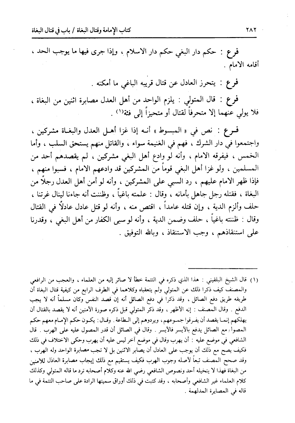فرع حكم دار البغي حكم دار الاسلام، وإذا جرى فيها ما يوجب الحد، أقامه الامام. فرع يتحرز العادل عن قتال قريبه الباغي ما أمكنه. فرع قال المتولي: يلزم الواحد من أهل العدل مصابرة اثنين من البغاة، فلا يولي عنهما إلا متحرفا لقتال أو متحيزا إلى فئة. فرع نص في المبسوط أنه إذا غزا أهل العدل والبغاة مشركين، واجتمعوا في دار الشرك، فهم في الغنيمة سواء، والقاتل منهم يستحق السلب، وأما الخمس، فيفرقه الامام، وأنه لو وادع أهل البغي مشركين، لم يقصدهم أحد من المسلمين، ولو غزا أهل البغي قوما من المشركين قد وادعهم الامام، فسبوا منهم، فإذا ظهر الامام عليهم، رد السبي على المشركين، وأنه لو أمن أهل العدل رجلا من البغاة، فقتله رجل جاهل بأمانه، وقال: علمته باغيا، وظننت أنه جاءنا لينال غرتنا، حلف وألزم الدية، وإن قتله عامدا، اقتص منه، وأنه لو قتل عادل عادلا في القتال وقال: ظننته باغيا، حلف وضمن الدية، وأنه لو سبى الكفار من أهل البغي، وقدرنا على استنقاذهم، وجب الاستنقاذ، وبالله التوفيق.