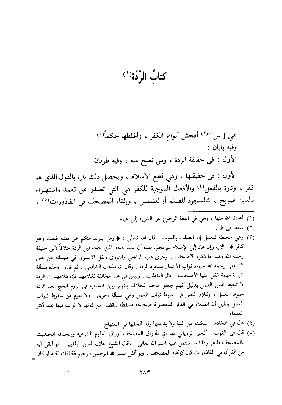 الأول : في حقيقتها، وهي قطع الاسلام، ويحصل ذلك تارة بالقول الذي هو كفر، وتارة بالفعل، والافعال الموجبة للكفر هي التي تصدر عن تعمد واستهزاء بالدين صريح، كالسجود للصنم أو للشمس، وإلقاء المصحف في القاذورات،