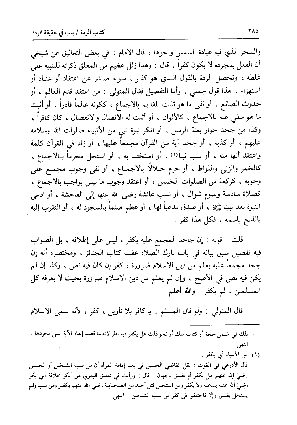 والسحر الذي فيه عبادة الشمس ونحوها، قال الامام: في بعض التعاليق عن شيخي أن الفعل بمجرده لا يكون كفرا، قال: وهذا زلل عظيم من المعلق ذكرته للتنبيه على غلطه، وتحصل الردة بالقول الذي هو كفر، سواء صدر عن اعتقاد أو عناء أو استهزاء، هذا قول جملي، وأما التفصيل فقال المتولي: من اعتقد قدم العالم، أو حدوث الصانع، أو نفى ما هو ثابت للقديم بالاجماع، ككونه عالما قادرا، أو أثبت ما هو منفي عنه بالاجماع، كالالوان، أو أثبت له الاتصال والانفصال، كان كافرا، وكذا من جحد جواز بعثة الرسل، أو أنكر نبوة نبي من الانبياء صلوات الله وسلامه عليهم، أو كذبه، أو جحد آية من القرآن مجمعا عليها، أو زاد في القرآن كلمة واعتقد أنها منه، أو سب نبيا، أو استخف به، أو استحل محرما بالاجماع كالخمر واللواط، أو حرم حلالا بالاجماع، أو نفى وجوب مجمع على وجوبه، كركعة من الصلوات الخمس، أو اعتقد وجوب ما ليس بواجب بالاجماع، كصلاة سادسة وصوم شوال، أو نسب عائشة رضي الله عنها إلى الفاحشة، أو ادعى النبوة بعد نبينا - صلى الله عليه وسلم - أو صدق مدعيا لها، أو عظم صنما بالسجود له، أو التقرب إليه بالذبح باسمه، فكل هذا كفر. قلت: قوله: إن جاحد المجمع عليه يكفر، ليس على إطلاقه، بل الصواب فيه تفصيل سبق بيانه في باب تارك الصلاة عقب كتاب الجنائز، ومختصره أنه إن جحد مجمعا عليه يعلم من دين الاسلام ضرورة، كفر إن كان فيه نص، وكذا إن لم يكن فيه نص في الاصح، وإن لم يعلم من دين الاسلام ضرورة بحيث لا يعرفه كل المسلمين، لم يكفر. والله أعلم. قال المتولي: ولو قال المسلم: يا كافر بلا تأويل، كفر، لانه سمى الاسلام