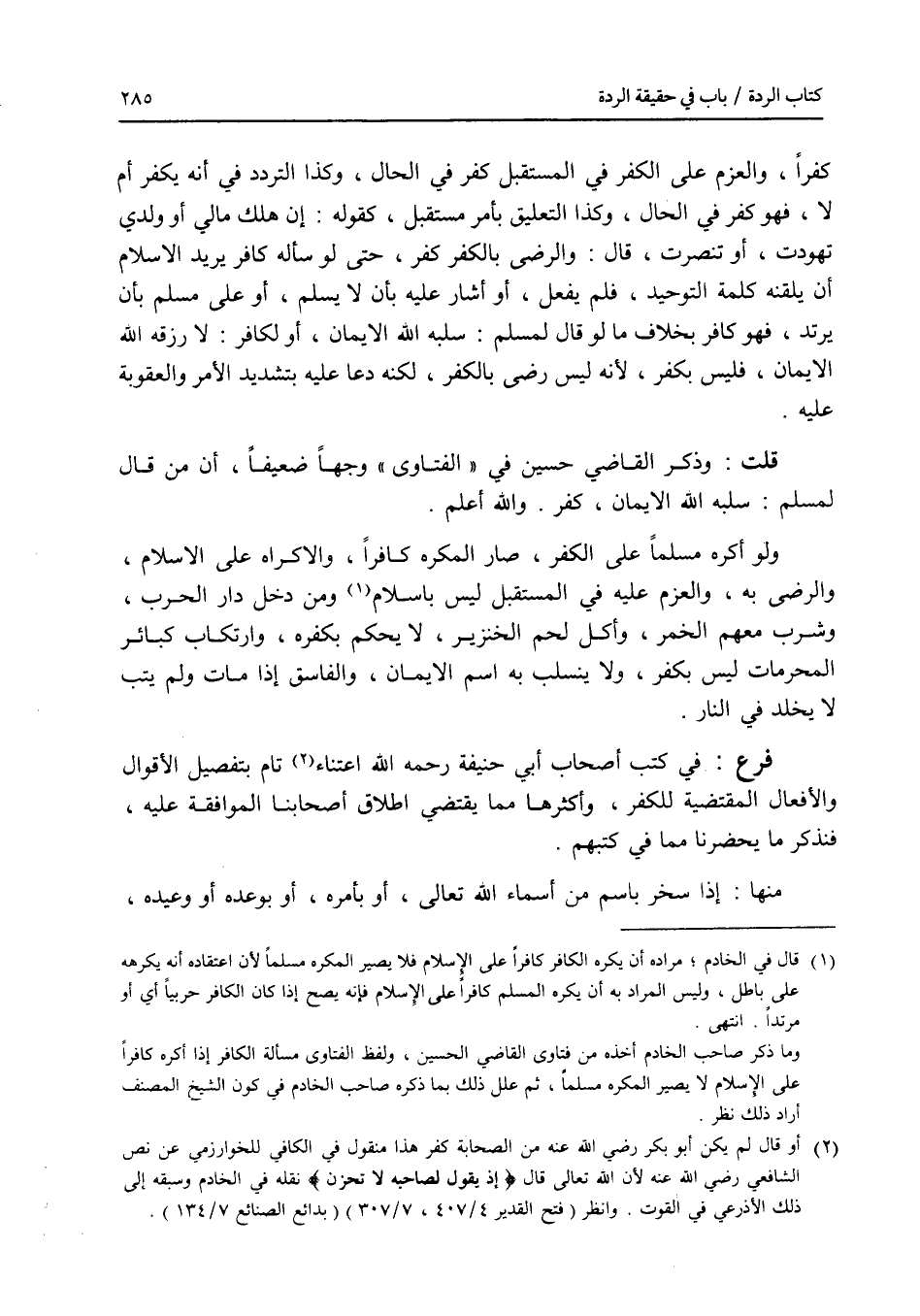 كفرا، والعزم على الكفر في المستقبل كفر في الحال، وكذا التردد في أنه يكفر أم لا، فهو كفر في الحال، وكذا التعليق بأمر مستقبل، كقوله: إن هلك مالي أو ولدي تهودت، أو تنصرت، قال: والرضى بالكفر كفر، حتى لو سأله كافر يريد الاسلام أن يلقنه كلمة التوحيد، فلم يفعل، أو أشار عليه بأن لا يسلم، أو على مسلم بأن يرتد، فهو كافر بخلاف ما لو قال لمسلم: سلبه الله الايمان، أو لكافر: لا رزقه الله الايمان، فليس بكفر، لانه ليس رضى بالكفر، لكنه دعا عليه بتشديد الامر والعقوبة عليه. قلت: وذكر القاضي حسين في الفتاوى وجها عيفا، أن من قال لمسلم: سلبه الله الايمان، كفر. والله أعلم. ولو أكره مسلما على الكفر، صار المكره كافرا، والاكراه على الاسلام، والرضى به، والعزم عليه في المستقبل ليس بإسلام، ومن دخل دار الحرب، وشرب معهم الخمر، وأكل لحم الخنزير، لا يحكم بكفره، وارتكاب كبائر المحرمات ليس بكفر، ولا ينسلب به اسم الايمان، والفاسق إذا مات ولم يتب لا يخلد في النار. فرع في كتب أصحاب أبي حنيفة رحمه الله اعتناء تام بتفصيل الاقوال والافعال المقتضية للكفر، وأكثرهما مما يقتضي إطلاق أصحابنا الموافقة عليه، فنذكر ما يحضرنا مما في كتبهم. منها: إذا سخر باسم من أسماء الله تعالى، أو بأمره، أو بوعده أو وعيده،