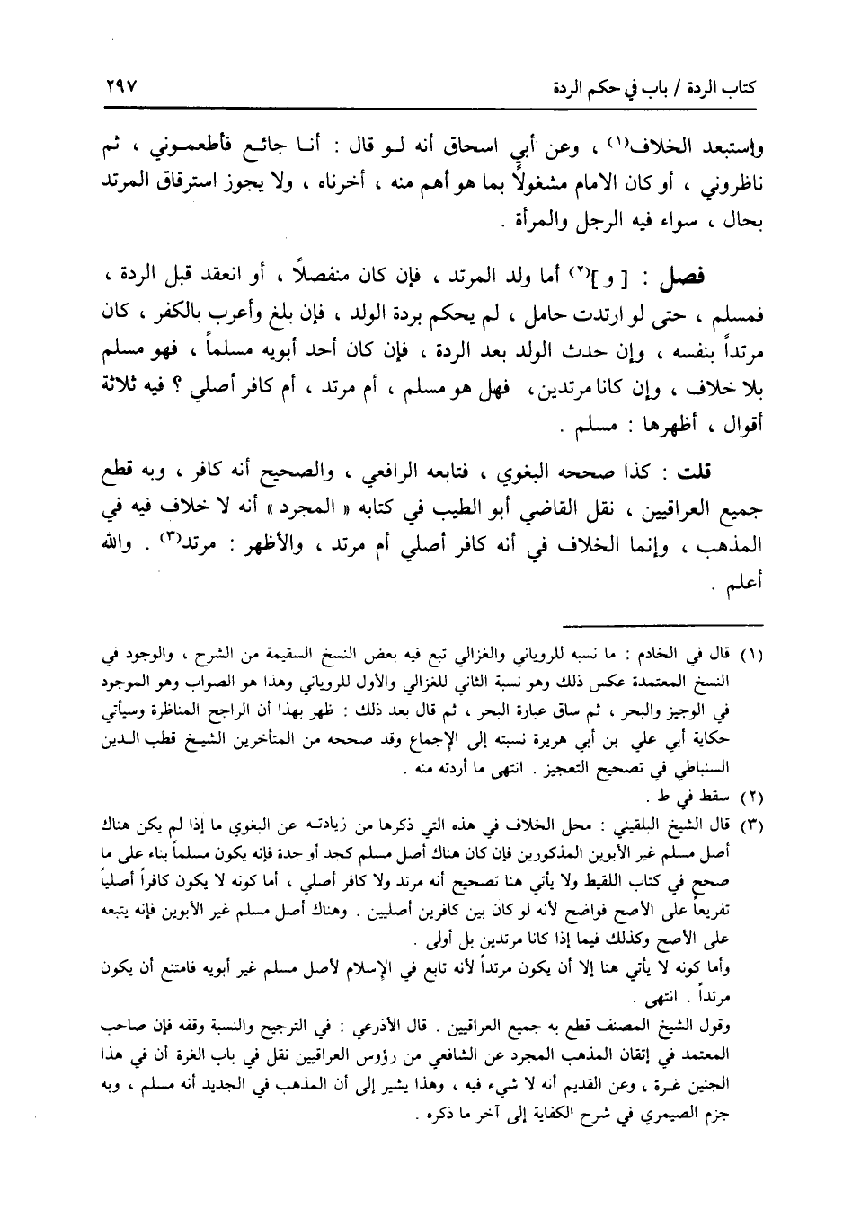 واستبعد الخلاف، وعن أبي إسحق أنه لو قال: أنا جائع فأطعموني، ثم ناظروني، أو كان الامام مشغولا بما هو أهم منه، أخرناه، ولا يجوز استرقاق المرتد بحال، سواء فيه الرجل والمرأة. فصل أما ولد المرتد، فإن كان منفصلا، أو انعقد قبل الردة، فمسلم، حتى لو ارتدت حامل، لم يحكم بردة الولد، فإن بلغ وأعرب بالكفر، كان مرتدا بنفسه، وإن حدث الولد بعد الردة، فإن كان أحد أبويه مسلما، فهو مسلم بلا خلاف، وإن كانا مرتدين، فهل هو مسلم، أم مرتد، أم كافر أصلي ؟ فيه ثلاثة أقوال، أظهرها: مسلم. قلت: كذا صححه البغوي، فتابعه الرافعي، والصحيح أنه كافر، وبه قطع جميع العراقيين، نقل القاضي أبو الطيب في كتابه المجرد أنه لا خلاف فيه في المذهب، وإنما الخلاف في أنه كافر أصلي أم مرتد، والاظهر: مرتد. والله أعلم.