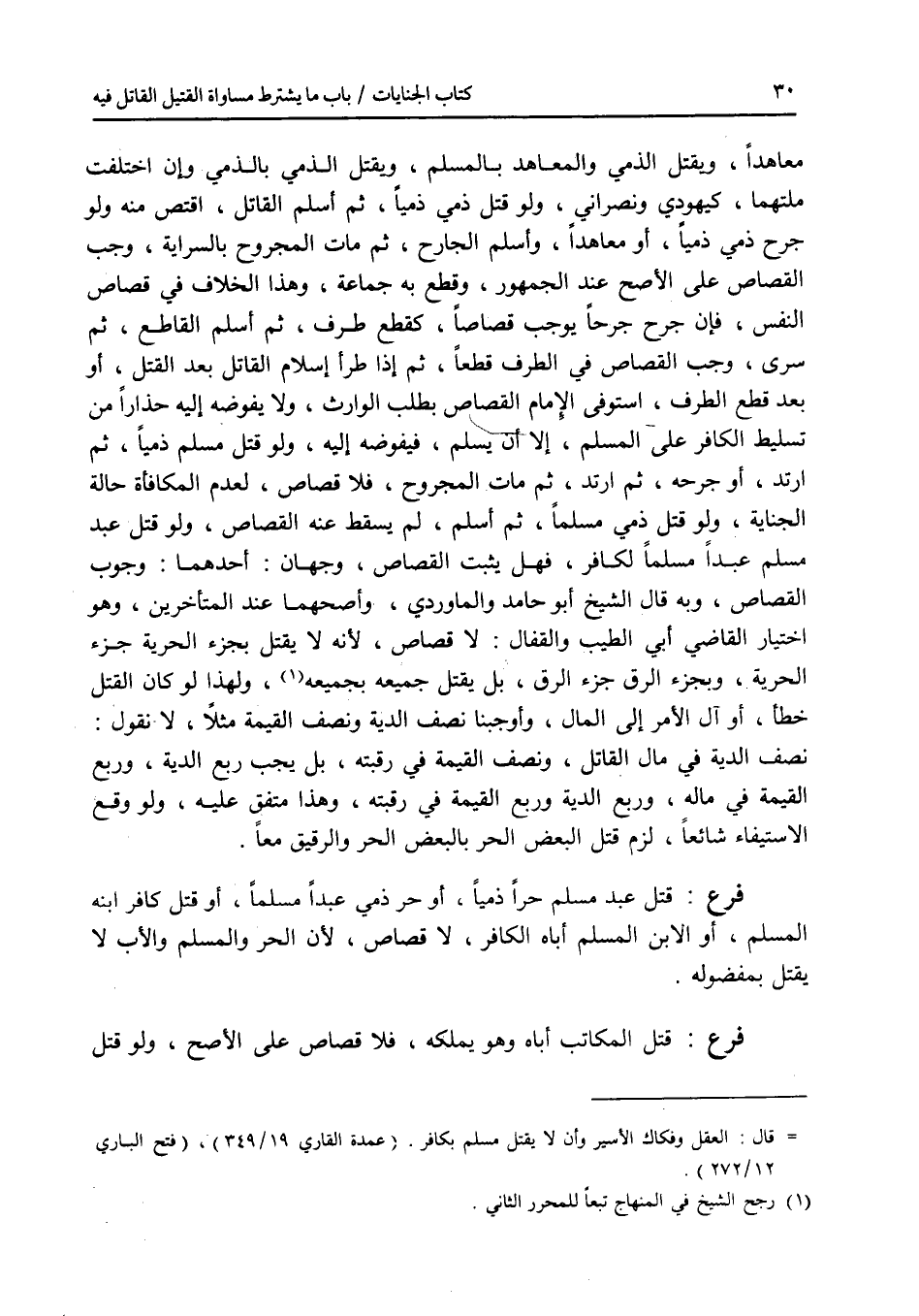 معاهدا، ويقتل الذمي والمعاهد بالمسلم، ويقتل الذمي بالذمي وإن اختلفت ملتهما، كيهودي ونصراني، ولو قتل ذمي ذميا، ثم أسلم القاتل، اقتص منه، ولو جرح ذمي ذميا، أو معاهدا، وأسلم الجارح، ثم مات المجروح بالسراية، وجب القصاص على الاصح عند الجمهور، وقطع به جماعة، وهذا الخلاف في قصاص النفس، فإن جرح جرحا يوجب قصاصا، كقطع طرف، ثم أسلم القاطع، ثم سرى، وجب القصاص في الطرف قطعا، ثم إذا طرأ إسلام القاتل بعد القتل، أو بعد قطع الطرف، استوفى الامام القصاص بطلب الوارث، ولا يفوضه إليه حذارا من تسليط الكافر على المسلم، إلا أن يسلم، فيفوضه إليه، ولو قتل مسلم ذميا، ثم ارتد، أو جرحه، ثم ارتد، ثم مات المجروح، فلا قصاص، لعدم المكافأة حالة الجناية، ولو قتل ذمي مسلما، ثم أسلم، لم يسقط عنه القصاص، ولو قتل عبد مسلم عبدا مسلما لكافر، فهل يثبت القصاص، وجهان: أحدهما: وجوب القصاص، وبه قال الشيخ أبو حامد والماوردي، وأصحهما عند المتأخرين، وهو اختيار القاضي أبي الطيب والقفال: لا قصاص، لانه لا يقتل بجزء الحرية جزء الحرية، وبجزء الرق جزء الرق، بل يقتل جميعه بجميعه، ولهذا لو كان القتل خطأ، أو آل الامر إلى المال، وأوجبنا نصف الدية ونصف القيمة مثلا، لا نقول: نصف الدية في مال القاتل، ونصف القيمة في رقبته، بل يجب ربع الدية، وربع القيمة في ماله، وربع الدية وربع القيمة في رقبته، وهذا متفق عليه، ولو وقع الاستيفاء شائعا، لزم قتل البعض الحر بالبعض الحر والرقيق معا. فرع قتل عبد مسلم حرا ذميا، أو حر ذمي عبدا مسلما، أو قتل كافر ابنه المسلم، أو الابن المسلم أباه الكافر، لا قصاص، لان الحر والمسلم والاب لا يقتل بمفضوله. فرع قتل المكاتب أباه وهو يملكه، فلا قصاص على الاصح، ولو قتل