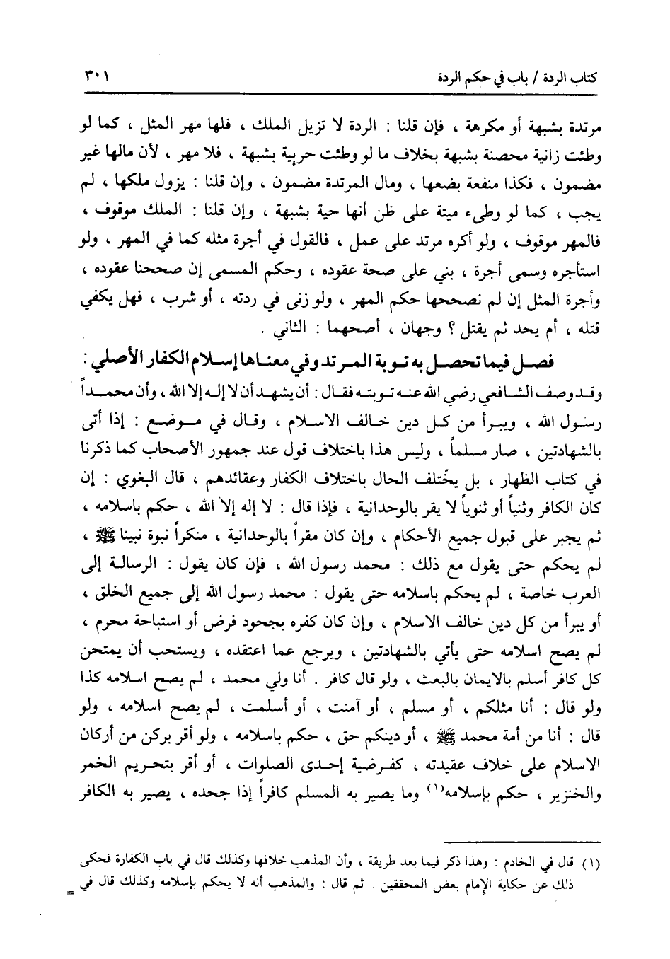 فصل فيما تحصل به توبة المرتد وفي معناها إسلام الكافر الأصلي وقد وصف الشافعي رضي الله عنه توبته فقال: أن يشهد أن لا إله إلا الله، وأن محمدا رسول الله، ويبرأ من كل دين خالف الاسلام، وقال في موضع: إذا أتى بالشهادتين، صار مسلما، وليس هذا باختلاف قول عند جمهور الاصحاب كما ذكرنا في كتاب الظهار، بل يختلف الحال باختلاف الكفار وعقائدهم، قال البغوي: إن كان الكافر وثنيا أو ثنويا لا يقر بالوحدانية، فإذا قال: لا إله إلا الله، حكم بإسلامه، ثم يجبر على قبول جميع الاحكام، وإن كان مقرا بالوحدانية، منكرا نبوة نبينا - صلى الله عليه وسلم -، لم يحكم بإسلامه حتى يقول مع ذلك: محمد رسول الله، فإن كان يقول: الرسالة إلى العرب خاصة، لم يحكم بإسلامه حتى يقول: محمد رسول الله إلى جميع الخلق، أو يبرأ من كل دين خالف الاسلام، وإن كان كفره بجحود فرض أو استباحة محرم، لم يصح إسلامه حتى يأتي بالشهادتين، ويرجع عما اعتقده، ويستحب أن يمتحن كل كافر أسلم بالايمان بالبعث، ولو قال كافر: أنا ولي محمد، لم يصح إسلامه كذا ولو قال: أنا مثلكم، أو مسلم أو آمنت، أو أسلمت، لم يصح إسلامه، ولو قال: أنا من أمة محمد - صلى الله عليه وسلم -، أو دينكم حق، حكم بإسلامه ولو أقر بركن من أركان الاسلام على خلاف عقيدته، كفرضية إحدى الصلوات، أو أقر بتحريم الخمر والخنزير، حكم بإسلامه، وما يصير به المسلم كافرا إذا جحده، يصير به الكافر