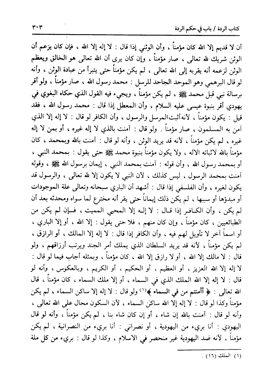 أن لا قديم إلا الله كان مؤمنا، وأن الوثني إذا قال: لا إله إلا الله، فإن كان يزعم أن الوثن شريك لله تعالى، صار مؤمنا، وإن كان يرى أن الله تعالى هو الخالق ويعظم الوثن لزعمه أنه يقربه إلى الله تعالى، لم يكن مؤمنا حتى يتبرأ من عبادة الوثن، وأنه لو قال البرهمي وهو الموحد الجاحد للرسل: محمد رسول الله، صار مؤمنا، ولو أقر برسالة نبي قبل محمد - صلى الله عليه وسلم -، لم يكن مؤمنا، ويجئ فيه القول الذي حكاه البغوي في يهودي أقر بنبوة عيسى - صلى الله عليه وسلم -، وأن المعطل إذا قال: محمد رسول الله، فقد قيل يكون مؤمنا لانه أثبت المرسل وإن الكافر لو قال: لا إله إلا الذي آمن به المسلمون، صار مؤمنا. ولو قال: آمنت بالذي لا إله غيره، أو بمن لا إله غيره، لم يكن مؤمنا، لانه قد يريد الوثن، وأنه لو قال: آمنت بالله وبمحمد، كان مؤمنا بالله لاثباته الاله، ولا يكون مؤمنا بنبوة محمد - صلى الله عليه وسلم - حتى يقول: بمحمد النبي، أو بمحمد رسول الله، وأن قوله: آمنت بمحمد النبي، إيمان برسول الله - صلى الله عليه وسلم -، وقوله: آمنت بمحمد الرسول، ليس كذلك، لان النبي لا يكون إلا لله تعالى، والرسول قد يكون لغيره، وان الفلسفي إذا قال: أشهد أن الباري سبحانه وتعالى علة الموجودات أو مبدؤها أو سببها، لم يكن ذلك إيمانا حتى يقر أنه مخترع لما سواه ومحدثه بعد أن لم يكن، وأن الكافر إذا قال: لا إله إلا المحيي المميت، فإن لم يك من الطبائعيين، كان مؤمنا، وإن كان منهم، فلا حتى يقول: إلا الله، أو إلا الباري، أو اسما آخر لا تأويل لهم فيه، وأن الكافر إذا قال: لا إله إلا المالك، أو الرازق، لم يكن مؤمنا، لانه قد يريد السلطان الذي يملك أمر الجند ويرتب أرزاقهم، ولو قال: لا مالك إلا الله، أو لا رازق إلا الله، كان مؤمنا، وبمثله أجاب فيما لو قال: لا إله إلا الله العزيز، أو العظيم، أو الحكيم، أو الكريم، وبالعكوس، وانه لو قال: لا إله إلا الله الملك الذي في السماء، أو إلا ملك السماء، كان مؤمنا، قال الله تعالى: * (أأمنتم من في السماء) *. ولو قال: لا إله إلا ساكن السماء، لم يكن مؤمنا، وكذا لو قال: لا إله إلا الله ساكن السماء، لان السكون محال على الله تعالى، وأنه لو قال: آمنت بالله إن شاء، أو إن كان شاء بنا، لم يكن مؤمنا، وأنه لو قال اليهودي: أنا برئ من اليهودية، أو نصراني: أنا برئ من النصرانية، لم يكن مؤمنا، لانه ضد اليهودية غير منحصر في الاسلام، وكذا لو قال: برئ من كل ملة