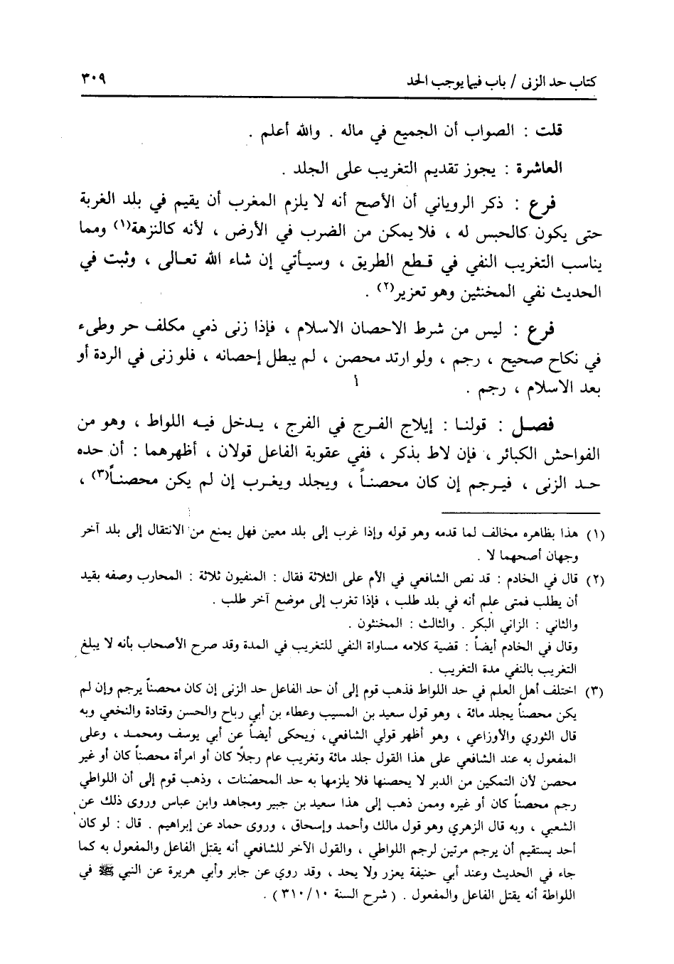 قلت: الصواب أن الجميع في ماله. والله أعلم. العاشرة: يجوز تقديم التغريب على المجلد. فرع ذكر الروياني أن الاصح أنه لا يلزم المغرب أن يقيم في بلد الغربة حتى يكون كالحبس له، فلا يمكن من الضرب في الارض، لانه كالنزهة، ومما يناسب التغريب النفي في قطع الطريق، وسيأتي إن شاء الله تعالى، وثبت في الحديث نفي المخنثين وهو تعزيز. فرع ليس من شرط الاحصان الاسلام، فإذا زنى ذمي مكلف حر وطئ في نكاح صحيح، رجم، ولو ارتد محصن، لم يبطل إحصانه، فلو زنى في الردة أو بعد الاسلام رجم.
