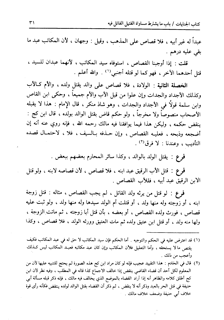 عبدا له غير أبيه، فلا قصاص على المذهب، وقيل: وجهان، لان المكاتب عبد ما بقي عليه درهم. قلت: إذا أوجبنا القصاص، استوفاه سيد المكاتب، لانهما عبدان للسيد، قتل أحدهما الآخر، فهو كما لو قتله أجنبي. والله أعلم. الخصلة الثالثة: الولادة، فلا قصاص على والد يقتل ولده، والام كالاب وكذلك الاجداد والجدات وإن علوا من قبل الاب والام جميعا، وحكى ابن القاص وابن سلمة قولا في الاجداد والجدات، وهو شاذ منكر، قال الامام: هذا لا يقبله الاصحاب منصوصا ولا مخرجا، ولو حكم قاض بقتل الوالد بولده، قال ابن كج: ينقض حكمه، وليكن هذا فيما يوافقنا فيه مالك رحمه الله، فإنه روي عنه أنه إن أضجعه وذبحه، فعليه القصاص، وإن حذفه بالسيف، فلا، لاحتمال قصده التأديب، وعندنا: لا فرق. فرع يقتل الولد بالوالد، وكذا سائر المحارم بعضهم ببعض. فرع قتل الاب الرقيق عبد ابنه، فلا قصاص، لان قصاصه لابنه، ولو قتل الابن الرقيق عبد أبيه، فللاب القصاص. فرع لو قتل من يرثه ولد القاتل، لم يجب القصاص، مثاله: قتل زوجة ابنه، أو زوجته وله منها ولد، أو قتلت أم الولد سيدها وله منها ولد، ولو ثبت عليه قصاص، فورث ولده القصاص، أو بعضه، بأن قتل أبا زوجته، ثم ماتت الزوجة، ولها منه ولد، أو قتل ابن عتيق ولده ثم مات العتيق وورثه الولد، فلا قصاص، وكذا