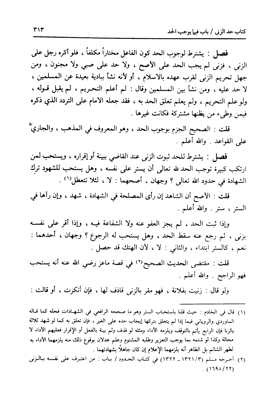 فصل يشترط لوجوب الحد كون الفاعل مختارا مكلفا، فلو أكره رجل على الزنى، فزنى لم يجب الحد على الاصح، ولا حد على صبي ولا مجنون، ومن جهل تحريم الزنى لقرب عهده بالاسلام، أو لانه نشأ ببادية بعيدة عن المسلمين، لا حد عليه، ومن نشأ بين المسلمين وقال: لم أعلم التحريم، لم يقبل قوله، ولو علم التحريم، ولم يعلم تعلق الحد به، فقد جعله الامام على التردد الذي ذكره فيمن وطئ من يظنها مشتركة فكانت غيرها. قلت: الصحيح الجزم بوجوب الحد، وهو المعروف في المذهب، والجاري على القواعد. والله أعلم. فصل يشترط للحد ثبوت الزنى عند القاضي ببينة أو إقراره، ويستحب لمن ارتكب كبيرة توجب الحد الله تعالى أن يستر على نفسه، وهل يستحب للشهود ترك الشهادة في حدود الله تعالى ؟ وجهان، أصحهما: لا، لئلا تتعطل. قلت: الاصح أن الشاهد إن رأى المصلحة في الشهادة، شهد، وإن رآها في الستر، ستر. والله أعلم. وإذا ثبت الحد، لم يجز العفو عنه ولا الشفاعة فيه، وإذا قرأ على نفسه بزنى، ثم رجع عنه سقط الحد، وهل يستحب له الرجوع ؟ وجهان، أحدهما: نعم كالستر ابتداء، والثاني: لا، لان الهتك قد حصل. قلت: مقتضى الحديث الصحيح في قصة ماعز رضي الله عنه أنه يستحب فهو الراجح والله أعلم. ولو قال: زينت بفلانة، فهو مقر بالزنى قاذف لها، فإن أنكرت، أو قالت: