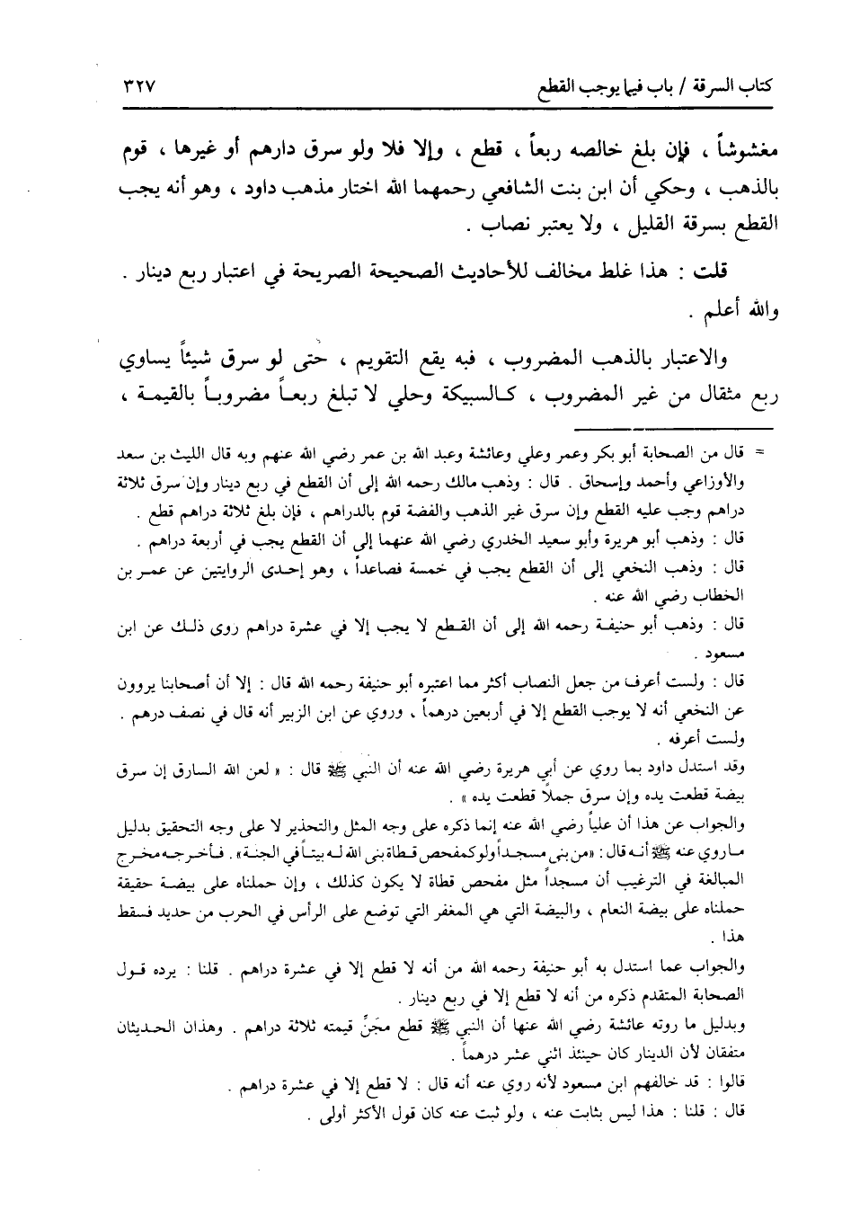 مغشوشا، فإن بلغ خالصه ربعا، قطع، وإلا فلا، ولو سرق دراهم أو غيرها، قوم بالذهب، وحكي أن ابن بنت الشافعي رحمهما الله اختار مذهب داود، وهو أنه يجب القطع بسرقة القليل، ولا يعتبر نصاب. قلت: هذا غلط مخالف للاحاديث الصحيحة الصريحة في اعتبار ربع دينار. والله أعلم. والاعتبار بالذهب المضروب، فبه يقع التقويم، حتى لو سرق شيئا يساوي ربع مثقال من غير المضروب، كالسبيكة وحلي لا تبلغ ربعا مضروبا بالقيمة،
