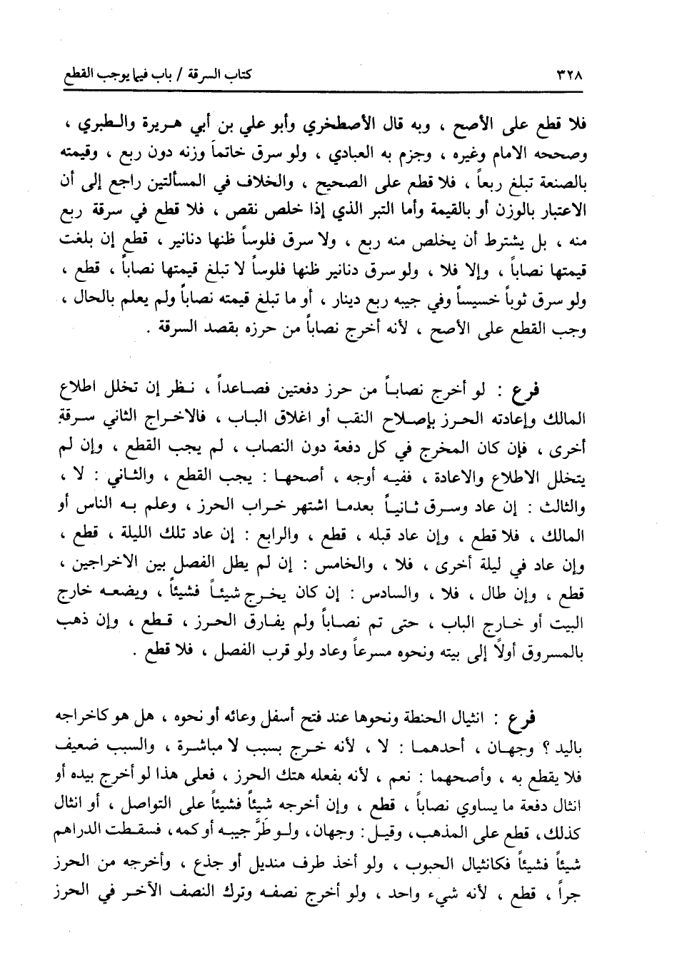 فلا قطع على الاصح، وبه قال الاصطخري وأبو علي ابن أبي هريرة والطبري، وصححه الامام وغيره، وجزم به العبادي، ولو سرق خاتما وزنه دون ربع، وقيمته بالصنعة تبلغ ربعا، فلا قطع على الصحيح، والخلاف في المسألتين راجع إلى أن الاعتبار بالوزن أو بالقيمة، وأما التبر الذي إذا خلص نقص، فلا قطع في سرقة ربع منه، بل يشترط أن يخلص منه رحع، ولا سرق فلوسا ظنها دنانير، قطع إن بلغت قيمتها نصابا، وإلا فلا، ولو سرق دنانير ظنها فلوسا لا تبلغ قيمتها نصابا، قطع، ولو سرق ثوبا خسيسا وفي جيبه ربع دينار، أو ما تبلغ قيمته نصابا ولم يعلم بالحال، وجب القطع على الاصح، لانه أخرج نصابا من حرزه بقصد السرقة. فرع لو أخرج نصابا من حرز دفعتين فصاعدا، نظر إن تخلل اطلاع المالك وإعادته الحرز بإصلاح النقب أو إغلاق الباب، فالاخراج الثاني سرقة أخرى، فإن كان المخرج في كل دفعة دون النصاب، لم يجب القطع، وإن لم يتخلل الاطلاع والاعادة، ففيه أوجه، أصحها: يجب القطع، والثاني: لا، والثالث: إن عاد وسرق ثانيا بعد ما اشتهر خراب الحرز، وعلم به الناس أو المالك، فلا قطع، وإن عاد قبله، قطع، والرابع: إن عاد تلك الليلة، قطع، وإن عاد في ليلة أخرى، فلا، والخامس: إن لم يطل الفصل بين الاخراجين، قطع، وإن طال، فلا، والسادس: إن كان يخرج شيئا فشيئا، ويضعه خارج البيت أو خارج الباب، حتى تم نصابا ولم يفارق الحرز، قطع، وإن ذهب بالمسروق أولا إلى بيته ونحوه مسرعا وعاد ولو مع قرب الفصل، فلا قطع. فرع انثيال الحنطة ونحوها عند فتح أسفل وعائه أو نحوه، هل هو كإخراجه باليد ؟ وجهان، أحدهما: لا، لانه خرج بسبب لا مباشرة، والسبب ضعيف فلا يقطع به، وأصحهما: نعم، لانه بفعله هتك الحرز، فعلى هذا لو أخرج بيده أو انثال دفعة ما يساوي نصابا، قطع، وإن أخرجه شيئا فشيئا على التواصل، أو انثال كذلك، قطع على المذهب، وقيل: وجهان، ولو طر جيبه أو كمه، فسقطت الدراهم شيئا فشيئا فكانثيال الحبوب، ولو أخذ طرف منديل أو جذع، وأخرجه من الحرز جرا، قطع، لانه شئ واحد، ولو أخرج نصفه وترك النصف الآخر في الحرز