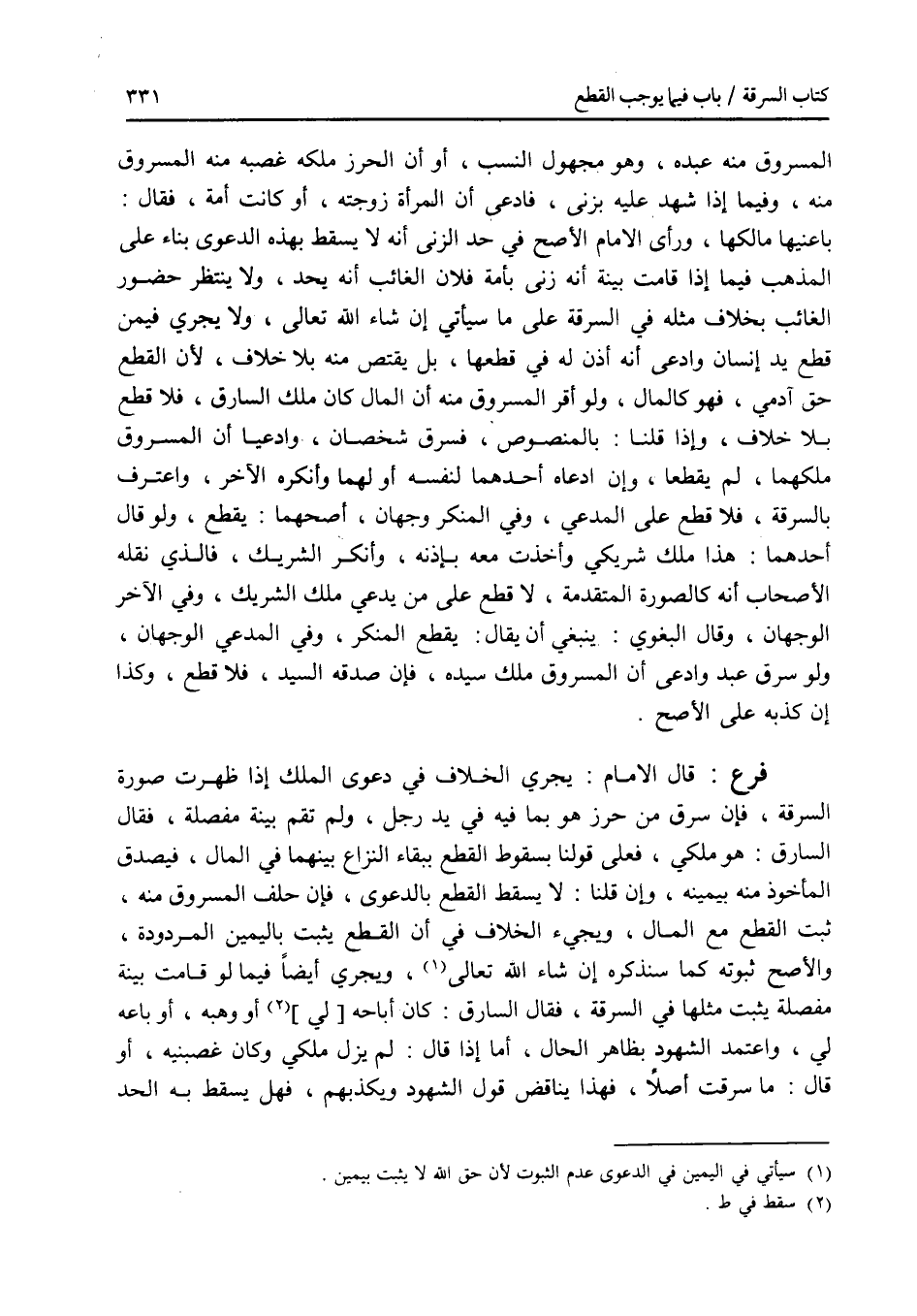 المسروق منه عبده، وهو مجهول النسب، أو أن الحرز ملكه غصبه منه المسروق منه، وفيما إذا شهد عليه بزنى، فادعى أن المرأة زوجته، أو كانت أمة، فقال: باعنيها مالكها، ورأى الامام الاصح في حد الزنى أنه لا يسقط بهذه الدعوى بناء على المذهب فيما إذا قامت بينة أنه زنى بأمة فلان الغائب أنه يحد، ولا ينتظر حضور الغائب بخلاف مثله في السرقة على ما سيأتي إن شاء الله تعالى، ولا يجري فيمن قطع يد إنسان وادعى أنه أذن له في قطعها، بل يقتص منه بلا خلاف، لان القطع حق آدمي، فهو كالمال، ولو أقر المسروق منه أن المال كان ملك السارق، فلا قطع بلا خلاف، وإذا قلنا: بالمنصوص، فسرق شخصان، وادعيا أن المسروق ملكهما، لم يقطعا، وإن ادعاه أحدهما لنفسه أولهما وأنكره الآخر، واعترف بالسرقة، فلا قطع على المدعي، وفي المنكر وجهان، أصحهما: يقطع، ولو قال أحدهما: هذا ملك شريكي وأخذت معه بإذنه، وأنكر الشريك، فالذي نقله الاصحاب أنه كالصورة المتقدمة، لا قطع على من يدعي ملك الشريك، وفي الآخر الوجهان، وقال البغوي: ينبغي أن يقال: يقطع المنكر، وفي المدعى الوجهان، ولو سرق عبد وادعى أن المسروق ملك سيده، فإن صدقه السيد، فلا قطع، وكذا إن كذبه على الاصح. فرع قال الامام: يجري الخلاف في دعوى الملك إذا ظهرت صورة السرقة، فإن سرق من حرز هو بما فيه في يد رجل، ولم تقم بينة مفصلة، فقال السارق: هو ملكي، فعلى قولنا بسقوط القطع ببقاء النزاع بينهما في المال، فيصدق المأخوذ منه بيمينه، وإن قلنا: لا يسقط القطع بالدعوى، فإن حلف المسروق منه، ثبت القطع مع المال، ويجئ الخلاف في أن القطع يثبت باليمين المردودة، والاصح ثبوته كما سنذكره إن شاء الله تعالى، ويجري أيضا فيما لو قامت بينة مفصلة يثبت مثلها في السرقة، فقال السارق: كان أباحه، أو وهبه، أو باعه لي، واعتمد الشهود ظاهر الحال، أما إذا قال: لم يزل ملكي وكان غصبنيه، أو قال: ما سرقت أصلا، فهذا يناقض قول الشهود ويكذبهم، فهل يسقط به الحد