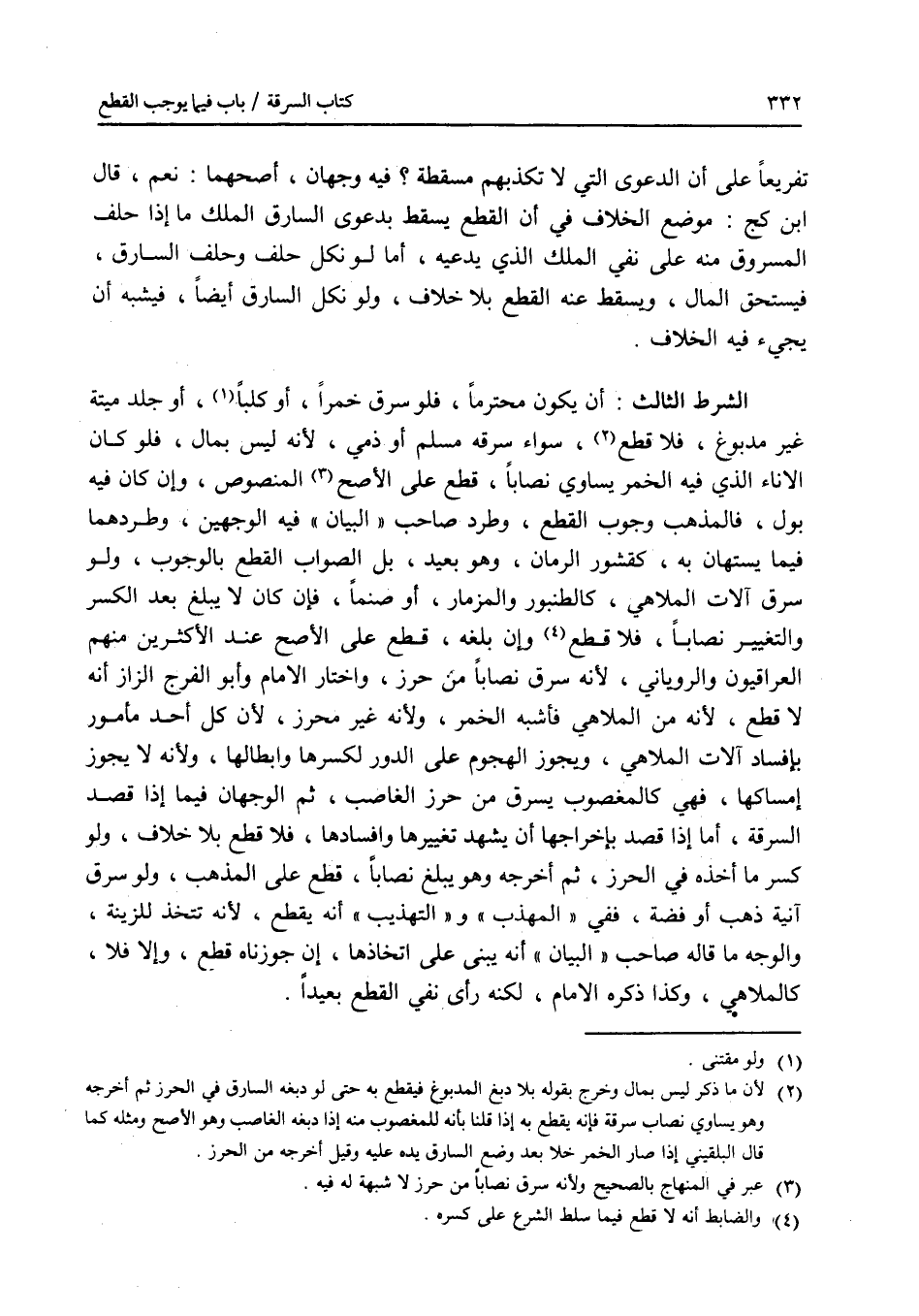 تفريعا على أن الدعوى التي لا تكذبهم مسقطة ؟ فيه وجهان، أصحهما: نعم، قال ابن كج: موضع الخلاف في أن القطع يسقط بدعوى السارق الملك ما إذا حلف المسروق منه على نفي الملك الذي يدعيه، أما لو نكل حلف وحلف السارق، فيستحق المال، ويسقط عنه القطع بلا خلاف، ولو نكل السارق أيضا، فيشبه أن يجئ فيه الخلاف. الشرط الثالث: أن يكون محترما، فلو سرق خمرا، أو كلبا، أو جلد ميتة غير مدبوغ، فلا قطع، سواء سرقه مسلم أم ذمي، لانه ليس بمال، فلو كان الاناء الذي فيه الخمر يساوي نصابا، قطع على الاصح المنصوص، وإن كان فيه بول، فالمذهب وجوب القطع، وطرد صاحب البيان فيه الوجهين، وطردهما فيما يستهان به، كقشور الرمان، وهو بعيد، بل الصواب القطع بالوجوب، ولو سرق آلات الملاهي، كالطنبور والمزمار، أو صنما، فإن كان لا يبلغ بعد الكسر والتغيير نصابا، فلا قطع، وإن بلغه، قطع على الاصح عند الاكثرين منهم العراقيون والروياني، لانه سرق نصابا من حرز، واختار الامام وأبو الفرج الزاز أنه لا قطع من الملاهي فأشبه الخمر، ولانه غير محرز، لان كل أحد مأمور بإفساد الآت الملاهي، ويجوز الهجوم على الدور لكسرها وإبطالها، ولانه لا يجوز إمساكها، فهي كالمغصوب يسرق من حرز الغاصب، ثم الوجهان فيما إذا قصد السرقة، أما إذا قصد بإخراجها أن يشهد تغييرها وإفسادها، فلا قطع بلا خلاف، ولو كسر ما أخذه في الحرز، ثم أخرجه وهو يبلغ نصابا، قطع على المذهب، ولو سرق آنية ذهب أو فضة، ففي المهذب والتهذيب إنه يقطع لانها تتخذ للزينة، والوجه ما قاله صاحب البيان أنه يبنى على اتخاذها، إن جوزناه قطع، وإلا فلا، كالملاهي، وكذا ذكره الامام، لكنه رأى نفي القطع بعيدا.