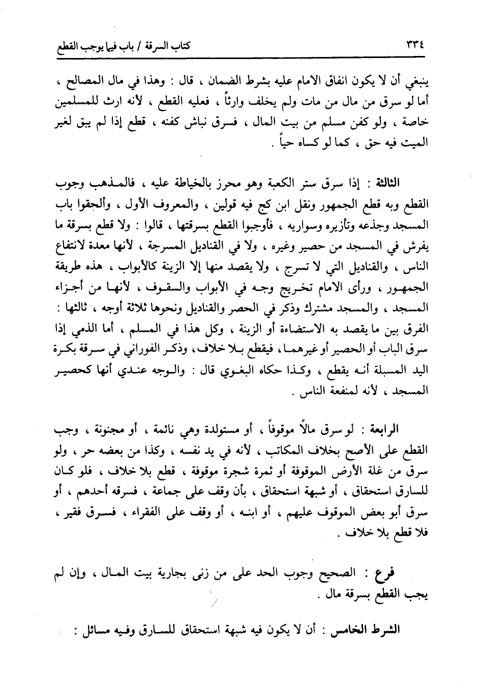ينبغي أن لا يكون إنفاق الامام عليه بشرط الضمان، قال: وهذا في مال المصالح، أما لو سرق من مال من مات ولم يخلف وارثا فعليه القطع، لانه إرث للمسلمين خاصة، ولو كفن مسلم من بيت المال، فسرق نباش كفنه، قطع إذا لم يبق لغير الميت فيه حق، كما لو كساه حيا. الثالثة: إذا سرق ستر الكعبة وهو محرز بالخياطة عليه، فالمذهب وجوب القطع وبه قطع الجمهور ونقل ابن كج فيه قولين، والمعروف الاول، وألحقوا باب المسجد وجذعه وتأزيره وسواريه، فأوجبوا القطع بسرقتها، قالوا: ولا قطع بسرقة ما يفرش في المسجد من حصير وغيره، ولا في القناديل المسرجة، لانها معدة لانتفاع الناس، والقناديل التي لا تسرج، ولا يقصد منها إلا الزينة كالابواب، هذه طريقة الجمهور، ورأى الامام تخريج وجه في الابواب والسقوف، لانها من أجزاء المسجد، والمسجد مشترك وذكر في الحصر والقناديل ونحوها ثلاثة أوجه، ثالثها: الفرق بين ما يقصد به الاستضاءة أو الزينة، وكل هذا في المسلم، أما الذمي إذا سرق الباب أو الحصير أو غيرهما، فيقطع بلا خلاف، وذكر الفوراني في سرقة بكرة اليد المسبلة أنه يقطع، وكذا حكاه البغوي قال: والوجه عندي أنها كحصير المسجد، لانها لمنفعة الناس. الرابعة: لو سرق مالا موقوفا، أو مستولدة وهي نائمة، أو مجنونة، وجب القطع على الاصح بخلاف المكاتب، لانه في يد نفسه، وكذا من بعضه حر، ولو سرق من غلة الارض الموقوفة أو ثمرة شجرة موقوفة، قطع بلا خلاف، فلو كان للسارق استحقاق، أو شبهة استحقاق، بأن وقف على جماعة، فسرقه أحدهم، أو سرق أبو بعض الموقوف عليهم، أو ابنه، أو وقف على الفقراء، فسرق فقير، فلا قطع بلا خلاف. فرع الصحيح وجوب الحد على من زنى بجارية بيت المال، وإن لم يجب القطع بسرقة مال. الشرط الخامس: أن لا يكون فيه شبهة استحقاق للسارق وفيه مسائل:
