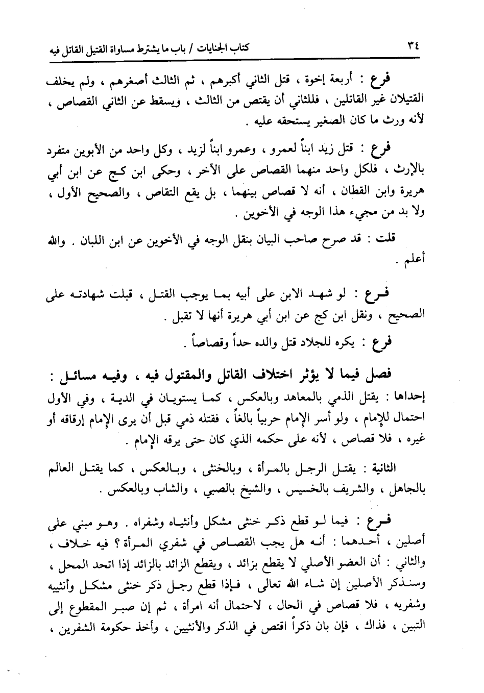 فصل فيما لا يؤثر اختلاف القاتل والمقتول فيه وفيه مسائل إحداها: يقتل الذمي بالمعاهد وبالعكس، كما يستويان في الدية، وفي الاول احتمال للامام، ولو أسر الامام حربيا بالغا، فقتله ذمي قبل أن يرى الامام إرقاقه أو غيره، فلا قصاص، لانه على حكمه الذي كان حتى يرقه الامام. الثانية: يقتل الرجل بالمرأة، وبالخنثى، وبالعكس، كما يقتل العالم بالجاهل، والشريف بالخسيس، والشيخ بالصبي، والشاب وبالعكس. فرع فيما لو قطع ذكر خنثى مشكل وأنثياه وشفراه. وهو مبني على أصلين، أحدهما: أنه هل يجب القصاص في شفري المرأة ؟ فيه خلاف، والثاني: أن العضو الاصلي لا يقطع بزائد، ويقطع الزائد بالزائد إذا اتحد المحل، وسنذكر الاصلين إن شاء الله تعالى، فإذا قطع رجل ذكر خنثى مشكل وأنثييه وشفريه، فلا قصاص في الحال، لاحتمال أنه إمرأة، ثم إن صبر المقطوع إلى التبين، فذاك، فإن بان ذكرا اقتص في الذكر والانثيين، وأخذ حكومة الشفرين،