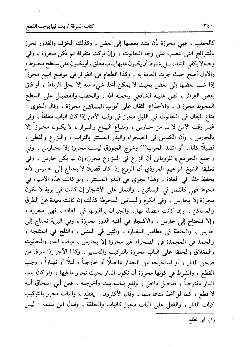كالحطب، فهي محرزة بأن يشد بعضها إلى بعض، وكذلك الخزف والقدور تحرز بالشرائح التي تنصب على وجه الحانوت، وإن تركت متفرقة لم تكن محرزة، وفي وجه لا يكفي الشد، بل يشترط أن يكون عليها باب مغلق، أو يكون على سطح محوط، والاول أصح حيث جرت العادة به، وكذا الطعام في الغرائر في موضع البيع محرزا إذا شد بعضها إلى بعض بحيث لا يمكن أخذ شئ منه إلا بحل الرباط، أو فتق بعض الغرائر، نص عليه الشافعي رحمه الله، والحطب والقصيل على السطح المحوط محرزان، والاجذاع الثقال على أبواب المساكين محرزة، وقال البغوي: متاع البقال في الحانوت في الليل محرز في وقت الامن إذا كان الباب، مغلقا، وفي غير وقت الامن لا بد من حارس، ومتاع البياع والبزار، لا يكون محرزا إلا بالحارس، وإن الكدس في الصحراء والبذر المستتر بالتراب، والزرع والقطن، قصيلا كانا، أو اشتد الحرب وخرج الجوزق ليست محرزة إلا بحارس، وفي جمع الجوامع للروياني أن الزرع في المزارع محرز وإن لم يكن حارس، وفي تعليقه الشيخ إبراهيم المروزذي أن الزرع إذا كان قصيلا لا يحتاج إلى حارس لانه يحفظ مثله في العادة، وهذا يجري في البذر المستتر، ولو كانت هذه الاشياء في محوط فهي كالثمار في البساتين، والثمار على الاشجار إنك كانت في برية لا تكون محرزة إلا بحارس، وفي الكرم والبساتين المحوطة كذلك إن كانت بعيدة عن الطرق والمساكن، وإن كانت متصلة بها، والجيران يراقبونها في العادة، فهي محرزة، وإلا فيحتاج إلى حارس والاشجار في أفنية الدور محرزة، وفي البرية تحتاج إلى حارس، والحنطة في مطامير المفازة، والتبن في المتبن، والثلج في المثلجة، والجمد في المجمدة في الصحراء غير محرزة إلا بحارس، وباب الدار والحانوت والمغلاق والحلقة على الباب محرزة بالتركيب والتسمير، وكذا الآجر إذا سرق من صحن الدار، أو استخرجه من الجدار داخلا أو خارجا، ليلا أو نهارا، وجب القطع، والشرط في كونها محرزة أن تكون الدار بحيث تحرز ما فيها، ولو كان باب الدار مفتوحا، فدخل داخل، وقلع باب بيت وأخرجه، فعن أبي إسحق أنه لا قطع، كما لو أخذ متاعا منها، وقال الاكثرون: يقطع، والباب محرز بالتركيب كباب الدار، والقفل على الباب محرز كالباب والحلقة، وقال ابن سلمة: ليس