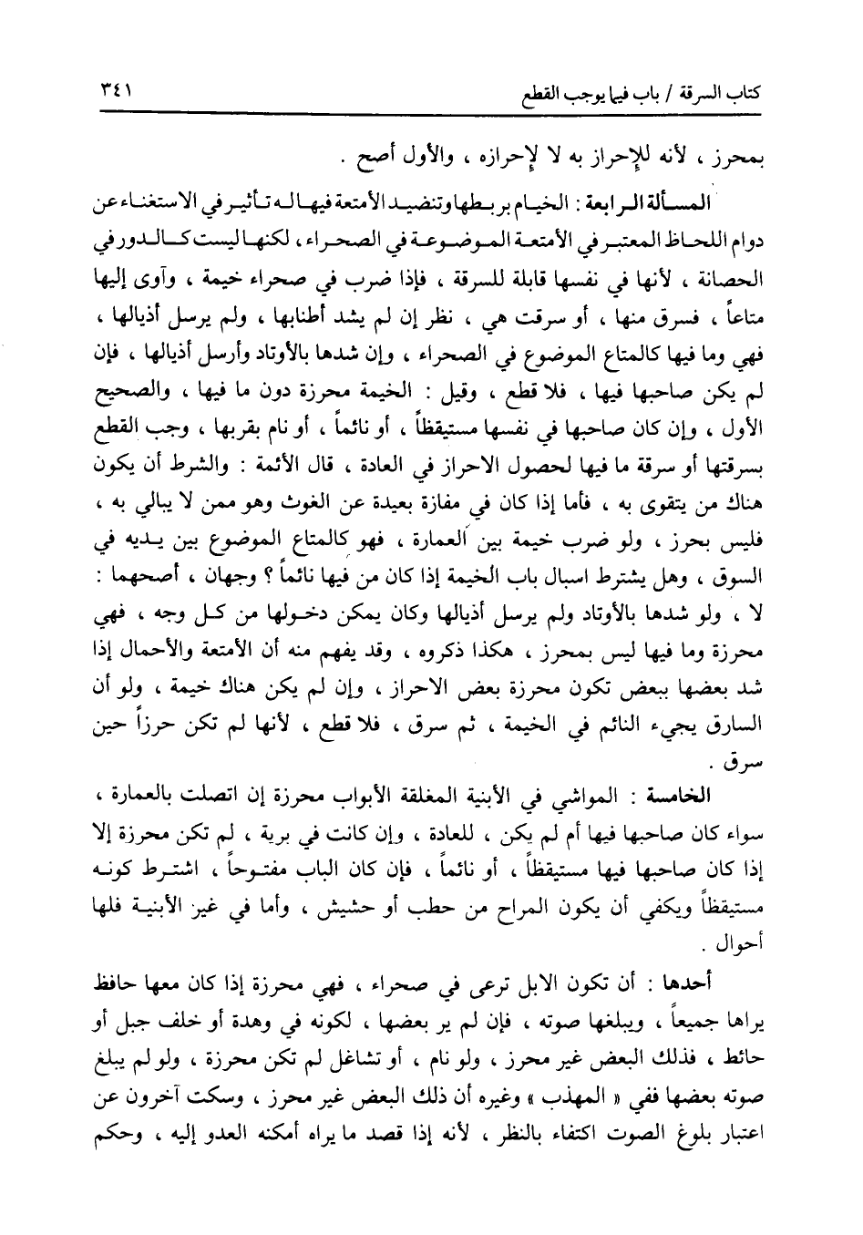 بمحرز، لانه للاحراز به لا لاحرازه، والاول أصح. المسألة الرابعة: الخيام بربطها وتنضيد الامتعة فيها له تأثير في الاستغناء عن دوام اللحاظ المعتبر في الامتعة الموضوعة في الصحراء، لكنها ليست كالدور في الحصانة، لانها في نفسها قابلة للسرقة، فإذا ضرب في صحراء خيمة، وآوي إليها متاعا، فسرق منها، أو سرقت هي، نظر إن لم يشد أطنابها، ولم يرسل أذيالها، فهي وما فيها كالمتاع الموضوع في الصحراء، وإن شدها بالاوتاد وأرسل أذيالها، فإن لم يكن صاحبها فيها، فلا قطع، وقيل: الخيمة محرزة دون ما فيها، والصحيح الاول، وإن كان صاحبها في نفسها مستيقظا، أو نائما، أو نام بقربها، وجب القطع بسرقتها أو سرقة ما فيها لحصول الاحراز في العادة، قال الائمة: والشرط أن يكون هناك من يتقوى به، فأما إذا كان في مفازة بعيدة عن الغوث وهو ممن لا يبالي به، فليس بحرز، ولو ضرب خيمة بين العمارة، فهو كالمتاع الموضوع بين يديه في السوق، وهل يشترط إسبال باب الخيمة إذا كان من فيها نائما ؟ وجهان، أصحهما: لا، ولو شدها بالاوتاد ولم يرسل أذيالها وكان يمكن دخولها من كل وجه، فهي محرزة وما فيها كيس بمحرز، هكذا ذكروه، وقد يفهم منه أن الامتعة والاحمال إذا شد بعضها ببعض تكون محرزة بعض الاحراز، وإن لم يكن هناك خيمة، ولو أن السارق يجئ النائم في الخيمة، ثم سرق، فلا قطع، لانها لم تكن حرزا حين سرق. الخامسة: المواشي في الابنية المغلقة الابواب محرزة إن اتصلت بالعمارة، سواء كان صاحبها فيها أم لم يكن، للعادة، وإن كانت في برية، لم تكن محرزة إلا إذا كان صاحبها فيها مستقيظا، أو نائما، فإن كان الباب مفتوحا، اشترط كونه مستيقظا، ويكفي أن يكون المراح من حطب أو حشيش، وأما في غير الابنية فلها أحوال. احدها: أن تكون الابل ترعى في صحراء، فهي محرزة إذا كان معها حافظ يراها جميعا، ويبلغها صوته، فإن لم ير بعضها، لكونه في وهدة أو خلف جبل أو حائط، فذلك البعض غير محرز، ولو نام، أو تشاغل لم تكن محرزة، ولو لم يبلغ صوته بعضها ففي المهذب وغيره أن ذلك البعض غير محرز، وسكت آخرون عن اعتبار بلوغ الصوت اكتفاء بالنظر، لانه إذا قصد ما يراه أمكنه العدو إليه، وحكم