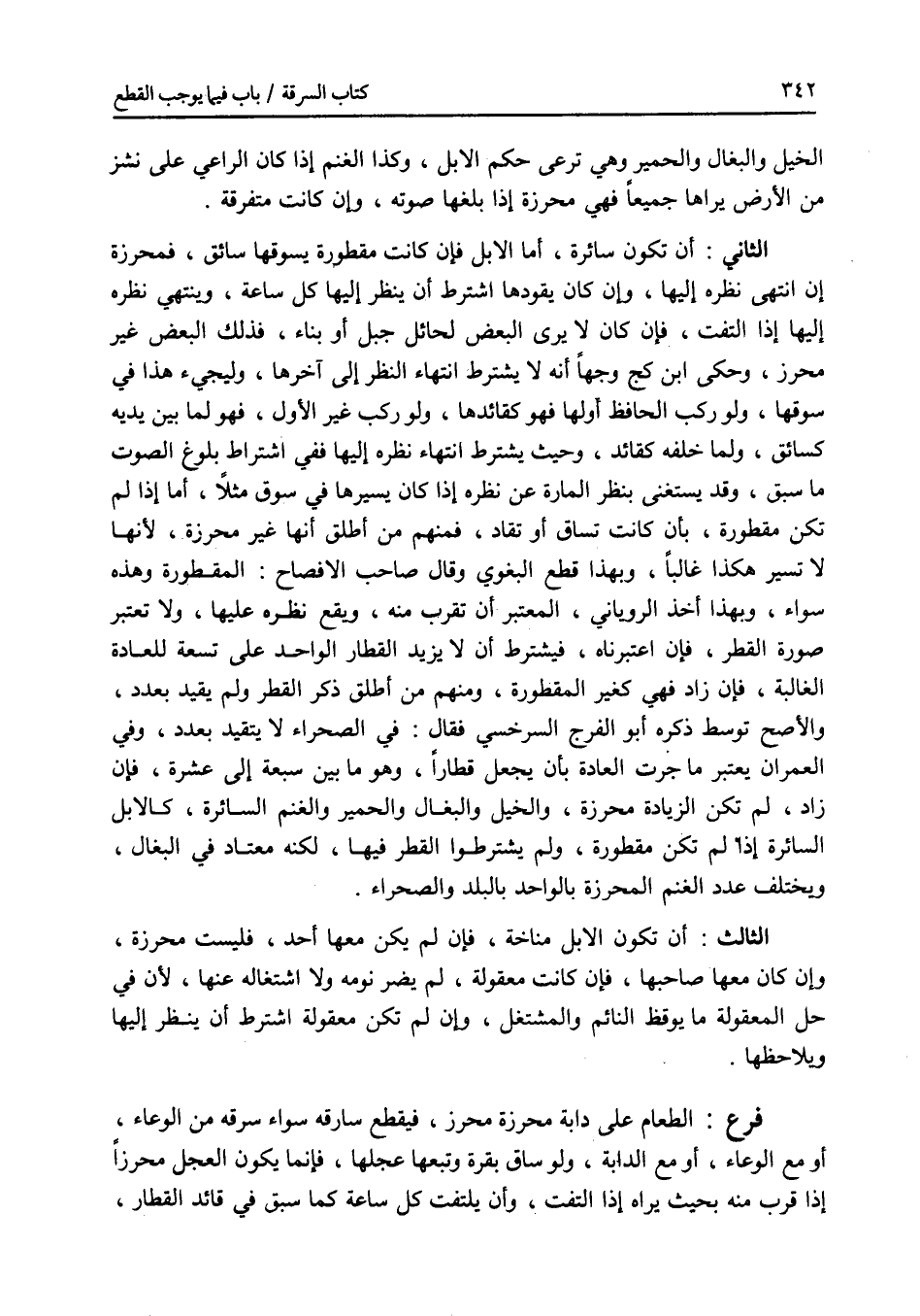 الخيل والبغال والحمير وهي ترعى حكم الابل، وكذا الغنم إذا كان الراعي على نشز من الارض يراها جميعا فهي محرزة إذا بلغها صوته، وإن كانت متفرقة. الثاني: أن تكون سائرة، أما الابل فإن كانت مقطورة يسوقها سائق، فمحرزة إن انتهى نظره إليها، وإن كانت يقودها اشترط أن ينظر إليه كل ساعة، وينتهي نظره إليها إذا التفت، فإن كان لا يرى البعض لحائل جبل أو بناء، فذلك البعض غير محرز، وحكى ابن كج وجها أنه لا يشترط انتهاء النظر إلى آخرها، وليجئ هذا في سوقها، ولو ركب الحافظ أولها فهو كقائدها، ولو ركب غير الاول، فهو لما بين يديه كسائق، ولما خلفه كقائد، وحيث يشترط انتهاء نظره إليها ففي اشتراط بلوغ الصوت ما سبق، وقد يستغنى بنظر المارة عن نظره إذا كان يسيرها في سوق مثلا، أما إذا لم تكن مقطورة، بأن كانت تساق أو تقاد، فمنهم من أطلق أنها غير محرزة، لانها لا تسير هكذا غالبا، وبهذا قطع البغوي وقال صاحب الافصاح: المقطورة وهذه سواء، وبهذا أخذ الروياني، المعتبر أن تقرب منه، ويقع نظره عليها، ولا تعتبر صورة القطر، فإن اعتبرناه، فيشترط أن لا يزيد القطار الواحد على تسعة للعادة الغالبة، فإن زاد فهي كغير المقطورة، ومنهم من أطلق ذكر القطر ولم يقيد بعدد، والاصح توسط ذكره أبو الفرج السرخسي فقال: في الصحراء لا يتقيد بعدد، وفي العمران يعتبر ما جرت العادة بأن يجعل قطارا، وهو ما بين سبعة إلى عشرة، فإن زاد، لم تكن الزيادة محرزة، والخيل والبغال والحمير والغنم السائرة، كالابل السائرة إذا لم تكن مقطورة، ولم يشترطوا القطر فيها، لكنه معتاد في البغال، ويختلف عدد الغنم المحرزة بالواحد بالبلد والصحراء. الثالث: أن تكون الابل مناخة، فإن لم يكن معها أحد، فليس محرزة، وإن كان معها صاحبها، فإن كانت معقولة، لم يضر نومه ولا اشتغاله عنها، لان في حل المعقولة ما يوقظ النائم والمشتغل، وإن لم تكن معقولة اشترط أن ينظر إليها ويلاحظها. فرع الطعام على دابة محرزة محرز، فيقطع سارقه سواء من الوعاء، أو مع الوعاء، أو مع الدابة، ولو ساق بقرة وتبعها عجلها، فإنما يكون العجل محرزا إذا قرب منه بحيث يراه إذا التفت، وأن يلتفت كل ساعة كما سبق في قائد القطار،