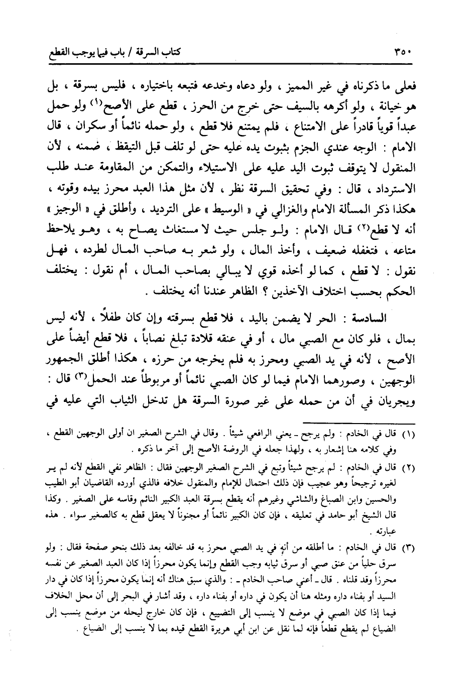 فعلى ما ذكرناه في غير المميز، ولو دعاه وخدها فتبعه باختياره، فليس بسرقة، بل هو خيانة، لو أكرهه بالسيف حتى خرج من الحرز، قطع على الاصح، ولو حمل عبدا قويا قادرا على الامتناع، فلم يمتنع، فلا قطع، ولو حمله نائما أو سكران، قال الامام: الوجه عندي الجزم بثبوت يده عليه حتى لو تلف قبل التيقظ، ضمنه، لان المنقول لا يتوقف ثبوت اليد عليه على الاستيلاء والتمكن من المقاومة عند طلب الاسترداد، قال: وفي تحقيق السرقة نظر، لان مثل هذا العبد محرز بيده وقوته، هكذا ذكر المسألة الامام والغزالي في الوسيط على الترديد، وأطلق في الوجيز أنه لا قطع، قال الامام: ولو جلس حيث لا مستغاث يصاح به، وهو يلاحظ متاعه، فتغفله ضعيف، وأخذ المال، ولو شعر به صاحب المال لطرده، فهل نقول: لا قطع، كما لو أخذه قوي لا يبالي بصاحب المال، أم نقول: يختلف الحكم بحسب اختلاف الآخذين ؟ الظاهر عندنا أنه يختلف. السادسة: الحر لا يضمن باليد، فلا قطع بسرقته وإن كان طفلا، لانه ليس بمال، فلو كان مع الصبي مال، أو في عنقه قلادة تبلغ نصابا، فلا قطع أيضا على الاصح، لانه في يد الصبي ومحرز به فلم يخرجه من حرزه، هكذا أطلق الجمهور الوجهين، وصورهما الامام فيما لو كان الصبي نائما أو مربوطا عند الحمل، قال: ويجريان في أن من حمله على غير صورة السرقة هل تدخل الثياب التي عليه في