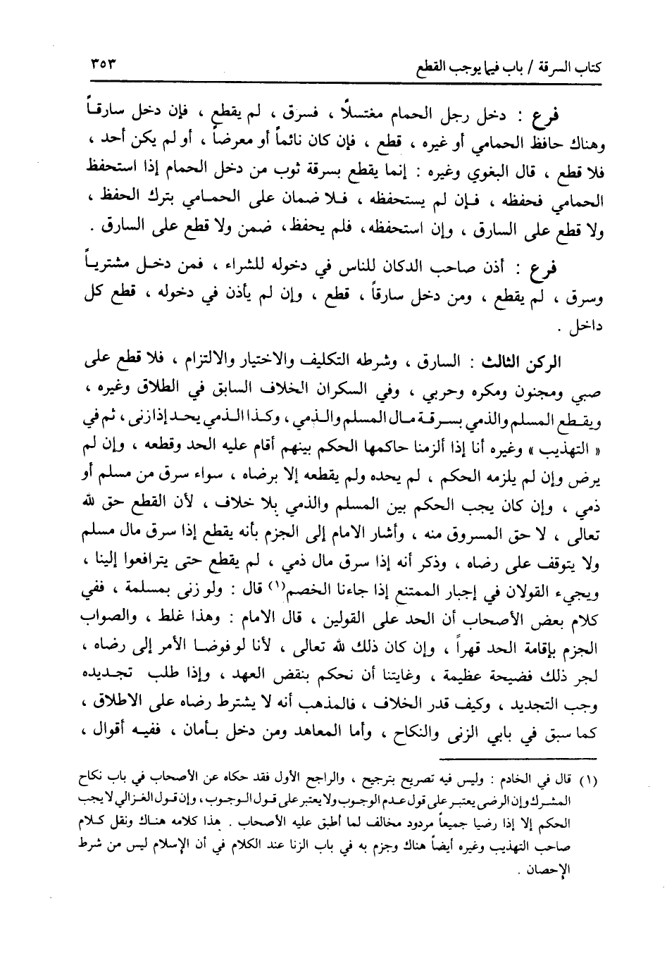 الركن الثالث : السارق، وشرطه التكليف والاختيار والالتزام، فلا قطع على صبي ومجنون ومكره وحربي، وفي السكران الخلاف السابق في الطلاق وغيره، ويقطع المسلم والذمي بسرقة مال المسلم والذمي، وكذا يحد الذمي إذا زنى، ثم في التهذيب وغيره أنا إذا ألزمنا حاكمها الحكم بينهم أقام عليه الحد وقطعه، وإن لم يرض وإن لم يلزمه الحكم، لم يحده ولم يقطعه إلا برضاه، سواء من مسلم أو ذمي، وإن كان يجب الحكم بين المسلم والذمي بلا خلاف، لان القطع حق الله تعالى، لا حق المسروق منه، وأشار الامام إلى الجزم بأنه قطع إذا سرق مال مسلم ولا يتوقف على رضاه، وذكر أنه إذا سرق مال ذمي، لم يقطع حتى يترافعوا إلينا، ويجئ القولان في إجبار الممتنع إذا جاءنا الخصم، قال: ولو زنى بمسلمة، ففي كلام بعض الاصحاب أن الحد على القولين، قال الامام: هذا غلط، والصواب الجزم بإقامة الحد قهرا، وإن كان ذلك لله تعالى، لانا لو فوضنا الامر إلى رضاه، لجر ذلك فضيحة عظيمة، وغايتنا أن نحكم بنقض العهد، وإذا طلب تجديده، وجب التجديد، وكيف قدر الخلاف، فالمذهب أنه لا يشترط رضاه على الاطلاق، كما سبق في بابي الزنى والنكاح، وأما المعاهد ومن دخل بأمان، ففيه أقوال،