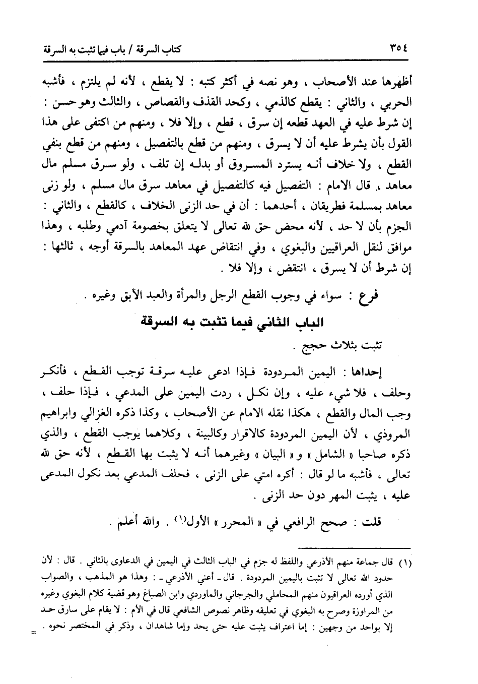 الباب الثاني : فيما تثبت به السرقة تثبت بثلاث حجج، إحداها: اليمين المردودة، فإذا ادعى عليه سرقة توجب القطع، فأنكر وحلف، فلا شئ عليه، وإن نكل، ردت اليمين على المدعي، فإذا حلف، وجب المال والقطع، هكذا نقله الامام عن الاصحاب، وكذا ذكره الغزالي وإبراهيم المروذي، لان اليمين المردودة كالاقرار وكالبينة، وكلاهما يوجب القطع، والذي ذكره صاحبا الشامل والبيان وغيرهما أنه لا يثبت بها القطع، لانه حق الله تعالى، فأشبه ما لو قال: أكره أمتي على الزنى، فحلف المدعي بعد نكول المدعي عليه، يثبت المهر دون حد الزنى. قلت: صحح الرافعي في المحرر الاول. والله أعلم.