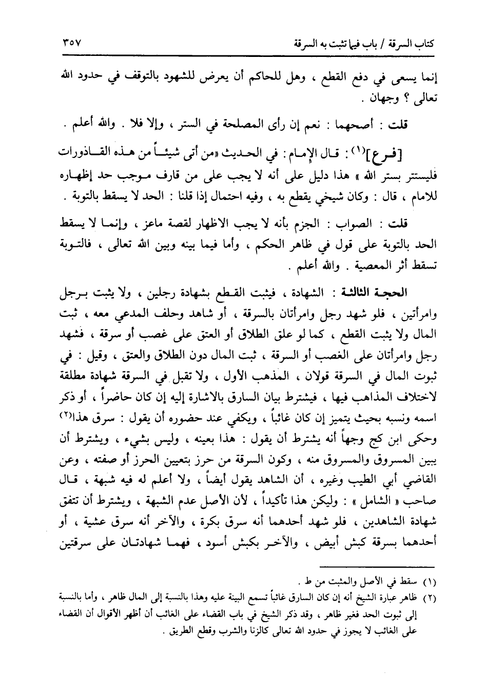 إنما يسعى في دفع القطع، وهل للحاكم أن يعرض للشهود بالتوقف في حدود الله تعالى ؟ وجهان. قلت: أصحهما: نعم إن رأى المصلحة في الستر، وإلا فلا. والله أعلم. فرع قال الامام: في الحديث من أتى شيئا من هذه القاذورات فليستتر بستر الله: هذا دليل على أنه لا يجب على من قارف موجب حد إظهاره للامام، قال: وكان شيخي يقطع به، وفيه احتمال إذا قلنا: الحد لا يسقط بالتوبة. قلت: الصواب: الجزم بأنه لا يجب الاظهار لقصة ماعز، وإنما لا يسقط الحد بالتوبة على قول في ظاهر الحكم، وأما فيما بينه وبين الله تعالى، فالتوبة تسقط أثر المعصية. والله أعلم. الحجة الثالثة: الشهادة، فيثبت القطع بشهادة رجلين، ولا يثبت برجل وامرأتين، فلو شهد رجل وامرأتان بالسرقة، أو شاهد وحلف المدعي معه، ثبت المال ولا يثبت القطع كما لو علق الطلاق أو العتق على غصب أو سرقة، فشهد رجل وامرأتان على الغصب أو السرقة، ثبت المال دون الطلاق والعتق، وقيل: في ثبوت المال في السرقة قولان، والمذهب الاول، ولا تقبل في السرقة شهادة مطلقة لاختلاف المذاهب فيها، فيشترط بيان السارق بالاشارة إليه إن كان حاضرا، أو ذكر اسمه ونسبه بحيث يتميز إن كان غائبا، ويكفي عند حضوره أن يقول: سرق هذا، وحكى ابن كج وجها أنه يشترط أن يقول، هذا بعينه، وليس بشئ، ويشترط أن يبين المسروق والمسروق منه، وكون السرقة من حرز بتعيين الحرز أو صفته، وعن القاضي أبي الطيب وغيره، أن الشاهد يقول أيضا، ولا أعلم له فيه شبهة، قال صاحب الشامل: وليكن هذا تأكيدا، لان الاصل عدم الشبهة، ويشترط أن تتفق شهادة الشاهدين، فلو شهد أحدهما أنه سرق بكرة، والآخر أنه سرق عشية، أو أحدهما بسرقة كبش أبيض، والآخر بكبش أسود، فهما شهادتان على سرقتين