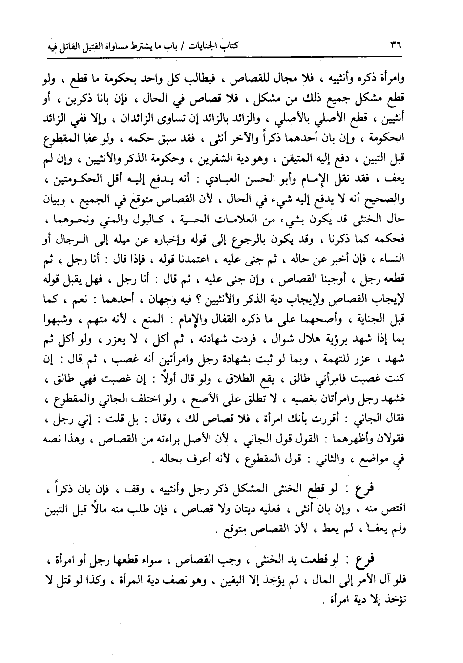 وإمرأة ذكره وأنثييه، فلا مجال للقصاص، فيطالب كل واحد بحكومة ما قطع، ولو قطع مشكل جميع ذلك من مشكل، فلا قصاص في الحال، فإن بانا ذكرين، أو أنثيين، قطع الاصلي بالاصلي، والزائد بالزائد إن تساوى الزائدان، وإلا ففي الزائد الحكومة، وإن بان أحدهما ذكرا والآخر أنثى، فقد سبق حكمه، ولو عفا المقطوع قبل التبين، دفع إليه المتيقن، وهو دية الشفرين، وحكومة الذكر والانثيين، وإن لم يعف، فقد نقل الامام وأبو الحسن العبادي: أنه يدفع إليه أقل الحكومتين، والصحيح أنه لا يدفع إليه شئ في الحال، لان القصاص متوقع في الجميع، وبيان حال الخنثى قد يكون بشئ من العلامات الحسية، كالبول والمني ونحوهما، فحكمه كما ذكرنا، وقد يكون بالرجوع إلى قوله وإخباره عن ميله إلى الرجال أو النساء، فإن أخبر عن حاله، ثم جني عليه، اعتمدنا قوله، فإذا قال: أنا رجل، ثم قطعه رجل، أوجبنا القصاص، وإن جني عليه، ثم قال: أنا رجل، فهل يقبل قوله لايجاب القصاص ولايجاب دية الذكر والانثيين ؟ فيه وجهان، أحدهما: نعم، كما قبل الجناية، وأصحهما على ما ذكره القفال والامام: المنع، لانه متهم، وشبهوا بما إذا شهد برؤية هلال شوال، فردت شهادته، ثم أكل، لا يعزر، ولو أكل ثم شهد، عزر للتهمة، وبما لو ثبت بشهادة رجل وامرأتين أنه غصب، ثم قال: إن كنت غصبت فامرأتي طالق، يقع الطلاق، ولو قال أولا: إن غصبت فهي طالق، فشهد رجل وامرأتان بغصبه، لا تطلق على الاصح، ولو اختلف الجاني والمقطوع، فقال الجاني: أقررت بأنك إمرأة، فلا قصاص لك، وقال: بل قلت: إني رجل، فقولان وأظهرهما: القول قول الجاني، لان الاصل براءته من القصاص، وهذا نصه في مواضع، والثاني: قول المقطوع، لانه أعرف بحاله. فرع لو قطع الخنثى المشكل ذكر رجل وأنثييه، وقف، فإن بان ذكرا، اقتص منه، وإن بان أنثى، فعليه ديتان ولا قصاص، فإن طلب منه مالا قبل التبين ولم يعف، لم يعط، لان القصاص متوقع. فرع لو قطعت يد الخنثى، وجب القصاص، سواء قطعها رجل أو إمرأة، فلوآل الامر إلى المال، لم يؤخذ إلا اليقين، وهو نصف دية المرأة، وكذا لو قتل لا تؤخذ إلا دية إمرأة.