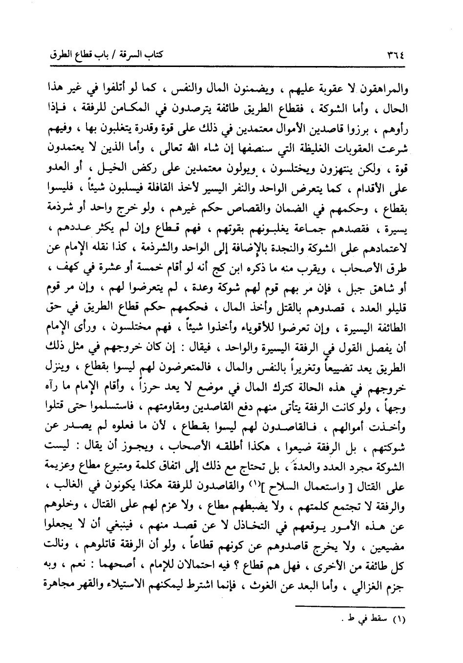 والمراهقون لا عقوبة عليهم، ويضمنون المال والنفس، كما لو أتلفوا في غير هذا الحال، وأما الشوكة، فقطاع الطريق طائفة يترصدون في المكامن للرفقة، فإذا رأوهم، برزوا قاصدين الاموال معتمدين في ذلك على قوة وقدرة يتغلبون بها، وفيهم شرعت العقوبات الغليظة التي سنصفها إن شاء الله تعالى، وأما الذين لا يعتمدون قوة، ولكن ينتهزون ويختلسون، ويولون معتمدين على ركض الخيل، أو العدو على الاقدام، كما يتعرض الواحد والنفر اليسير لاخذ القافلة فيسلبون شيئا، فليسوا بقطاع، وحكمهم في الضمان والقصاص حكم غيرهم، ولو خرج واحد أو شرذمة يسيرة، فقصدهم جماعة يغلبونهم بقوتهم، فهم قطاع وإن لم يكثر عددهم، لاعتمادهم على الشوكة والنجدة بالاضافة إلى الواحد والشرذمة، كذا نقله الامام عن طرق الاصحاب، ويقرب منه ما ذكره ابن كج أنه لو أقام خمسة أو عشرة في كهف، أو شاهق جبل، فإن مر بهم قوم لهم شوكة وعدة، لم يتعرضوا لهم، وإن مر قوم قليلو العدد، قصدوهم بالقتل وأخذ المال، فحكمهم حكم قطاع الطريق في حق الطائفة اليسيرة، وإن تعرضوا للاقوياء وأخذوا شيئا، فهم مختلسون، ورأى الامام أن يفصل القول في الرفقة اليسيرة والواحد، فيقال: إن كان خروجهم في مثل ذلك الطريق يعد تضييعا وتغريرا بالنفس والمال، فالمتعرضون لهم ليسوا بقطاع، وينزل خروجهم في هذه الحالة كترك المال في موضع لا يعد حرزا، وأقام الامام ما رآه وجها، ولو كانت الرفقة يتأتى منهم دفع القاصدين ومقاومتهم، فاستسلموا حتى قتلوا وأخذت أموالهم، فالقاصدون لهم ليسوا بقطاع، لان ما فعلوه لم يصدر عن شوكتهم، بل الرفقة ضيعوا، هكذا أطلقه الاصحاب، ويجوز أن يقال: ليست الشوكة مجرد العدد والعدة، بل تحتاج مع ذلك إلى اتفاق كلمة ومتبوع مطاع وعزيمة على القتال، والقاصدون للرفقة هكذا يكونون في الغالب، والرفقة لا تجتمع كلمتهم، ولا يضبطهم مطاع، ولا عزم لهم على القتال، وخلوهم عن هذه الامور يوقعهم في التخاذل لا عن قصد منهم، فينبغي أن لا يجعلوا مضيعين، ولا يخرج قاصدوهم عن كونهم قطاعا، ولو أن الرفقة قاتلوهم، ونالت كل طائفة من الاخرى، فهل هم قطاع ؟ فيه احتمالان للامام، أصحهما: نعم، وبه جزم الغزالي، وأما البعد عن الغوث، فإنما اشترط ليمكنهم الاستيلاء والقهر مجاهرة