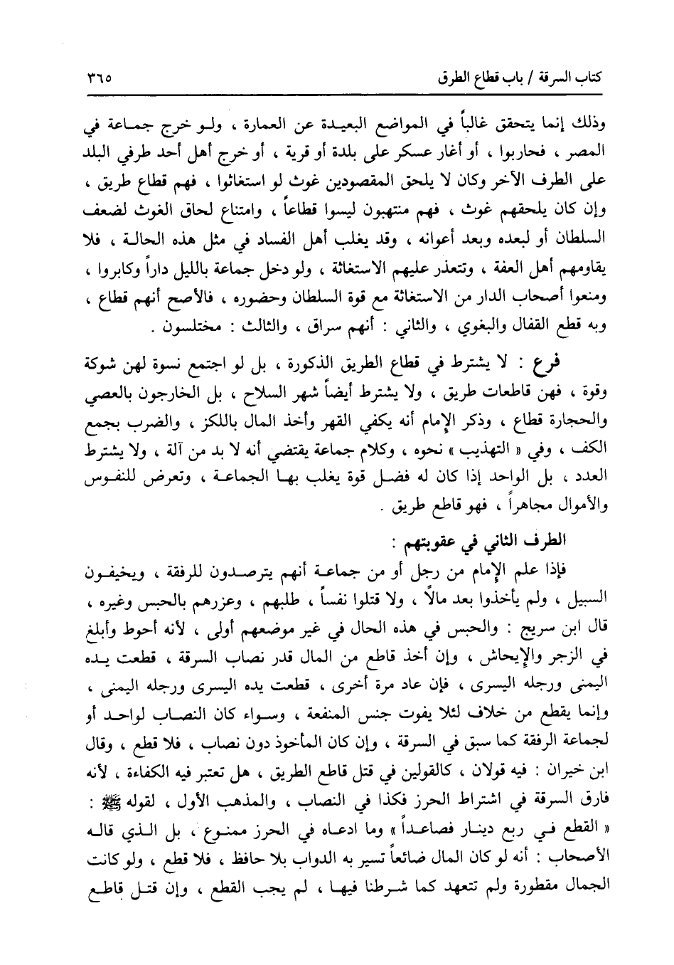 وذلك إنما يتحقق غالبا في المواضع البعيدة عن العمارة، ولو خرج جماعة في المصر، فحاربوا، أو أغار عسكر على بلدة أو قرية، أو خرج أهل أحد طرفي الجلد على الطرف الآخر وكان لا يلحق المقصودين غوث لو استغاثوا، فهم قطاع طريق، وإن كان يلحقهم غوث، فهم منتهبون ليسوا قطاعا، وامتناع لحاق الغوث لضعف السلطان أو لبعده وبعد أعوانه، وقد يغلب أهل الفساد في مثل هذه الحالة، فلا يقاومهم أهل العفة، وتتعذر عليهم الاستغاثة، ولو دخل جماعة بالليل دارا وكابروا، ومنعوا أصحاب الدار من الاستغاثة مع قوة السلطان وحضوره، فالاصح أنهم قطاع، وبه قطع القفال والبغوي، والثاني: أنهم سراق، والثالث: مختلسون. فرع لا يشترط في قطاع الطريق الذكورة، بل لو اجتمع نسوة لهن شوكة وقوة، فهن قاطعات طريق، ولا يشترط أيضا شهر السلاح، بل الخارجون بالعصي والحجارة قطاع، وذكر الامام أنه يكفي القهر وأخذ المال باللكز، والضرب بجمع الكف، وفي التهذيب نحوه، وكلام جماعة يقتضي أنه لا بد من آلة، ولا يشترط العدد، بل الواحد إذا كان له فضل قوة يغلب بها الجماعة، وتعرض للنفوس والاموال مجاهرا، فهو قاطع طريق.