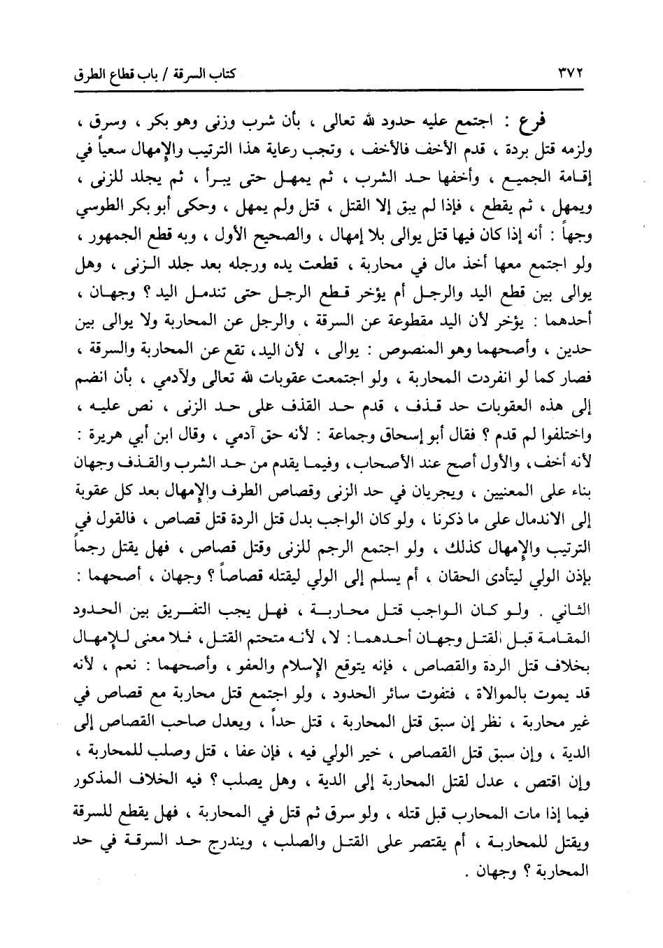فرع اجتمع عليه حدود لله تعالى، بأن شرب وزنى وهو بكر، وسرق، ولزمه قتل بردة، قدم الاخف فالاخف، وتجب رعاية هذا الترتيب والامهال سعيا في إقامة الجميع، وأخفها حد الشرب، ثم يمهل حتى يبرأ، ثم يجلد للزنى، ويمهل، ثم يقطع، فإذا لم يبق إلا القتل، قتل ولم يمهل، وحكى أبو بكر الطوسي وجها: أنه إذا كان فيها قتل يوالى بلا إمهال، والصحيح الاول، وبه قطع الجمهور، ولو اجتمع معها أخذ مال في محاربة، قطعت يده ورجله بعد جلد الزنى، وهل يوالى بين قطع اليد والرجل أم يؤخر قطع الرجل حتى تندمل اليد ؟ وجهان، أحدهما: يؤخر لان اليد مقطوعة عن السرقة، والرجل عن المحاربة ولا يوالى بين حدين، وأصحهما وهو المنصوص: يوالى، لان اليد تقع عن المحاربة والسرقة، فصار كما لو انفردت المحاربة، ولو اجتمعت عقوبات لله تعالى ولآدمي، بأن انضم إلى هذه العقوبات حد قذف، قدم حد القذف على حد الزنى، نص عليه، واختلفوا لم قدم ؟ فقال أبو إسحق وجماعة: لانه حق آدمي، وقال ابن أبي هريرة: لانه أخف، والاول أصح عند الاصحاب، وفيما يقدم من حد الشرب والقذف وجهان بناء على المعنيين، ويجريان في حد الزنى وقصاص الطرف والامهال بعد كل عقوبة إلى الاندمال على ما ذكرنا، ولو كان الواجب بدل قتل الردة قتل قصاص، فالقول في الترتيب والامهال كذلك، ولو اجتمع الرجم للزنى وقتل قصاص، فهل يقتل رجما بإذن الولي ليتأدى الحقان، أم يسلم إلى الولي ليقتله قصاصا ؟ وجهان، أصحهما: الثاني. ولو كان الواجب قتل محاربة، فهل يجب التفريق بين الحدود المقامة قبل القتل ؟ وجهان، أحدهما: لا، لجنه متحتم القتل، فلا معنى للامهال بخلاف قتل الردة والقصاص، فإنه يتوقع الاسلام والعفو، وأصحهما: نعم، لانه قد يموت بالموالاة، فتفوت سائر الحدود، ولو اجتمع قتل محاربة مع قصاص في غير محاربة، نظر إن سبق قتل المحاربة، قتل حدا، ويعدل صاحب القصاص إلى الدية، وإن سبق قتل القصاص، خير الولي فيه، فإن عفا، قتل وصلب للمحاربة، وإن اقتص، عدل لقتل المحاربة إلى الدية، وهل يصلب ؟ فيه الخلاف المذكور فيما إذا مات المحارب قبل قتله، ولو سرق ثم قتل في المحاربة، فهل يقطع للسرقة ويقتل للمحاربة، أم يقتصر على القتل والصلب، ويندرج حد السرقة في حد المحاربة ؟ وجهان.