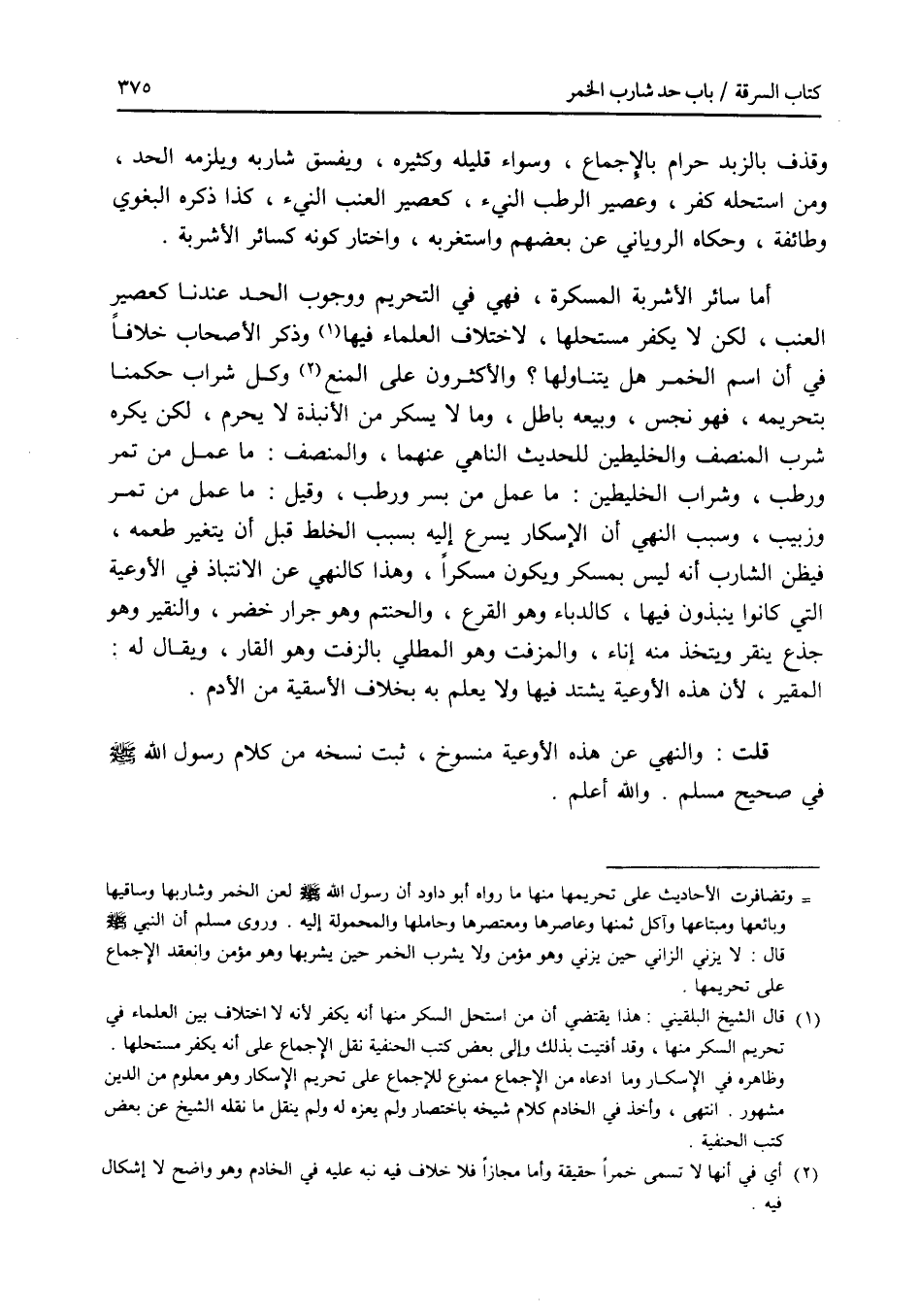 وقذف بالزبد حرام بالاجماع، وسواء قليله وكثيره، ويفسق شاربه ويلزمه الحد، ومن استحله كفر، وعصير الرطب النئ، كعصير العنب النئ، كذا ذكره البغوي وطائفة، وحكاه الروياني عن بعضهم واستغربه، واختار كونه كسائر الاشربة، أما سائر الاشربة المسكرة، فهي في التحريم ووجوب الحد عندنا كعصير العنب، لكن لا يكفر مستحلها، لاختلاف العلماء فيها، وذكر الاصحاب خلافا في أن اسم الخمر هل يتناولها ؟ والاكثرون على المنع، وكل شراب حكمنا بتحريمه، فهو نجس، وبيعه باطل، وما لا يسكر من الأنبذة لا يحرم، لكن يكره شرب المنصف والخليطين للحديث الناهي عنهما، والمنصف: ما عمل من تمر ورطب، وشراب الخليطين ما عمل من بسر ورطب، وقيل: ما عمل من تمر وزبيب، وسبب النهي أن الاسكار يسرع إليه بسبب الخلط قبل أن يتغير طعمه، فيظن الشارب أنه ليس بمسكر ويكون مسكرا، وهذا كالنهي عن الانتباذ في الاوعية التي كانوا ينبذون فيها، كالدباء وهو القرع، والحنتم وهو جرار خضر، والنقير وهو جذع ينقر ويتخذ منه إناء، والمزفت وهو المطلي بالزفت وهو القار، ويقال له: المقير، لان هذه الاوعية يشتد فيها ولا يعلم به بخلاف الاسقية من الادم. قلت: والنهي عن هذه الاوعية منسوخ، ثبت نسخه من كلام رسول الله صلى الله عليه وسلم في صحيح مسلم. والله أعلم.