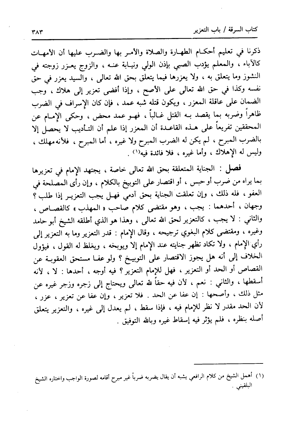 ذكرنا في تعليم أحكام الطهارة والصلاة والامر بها والضرب عليها أن الامهات كالآباء، والمعلم يؤدب الصبي بإذن الولي ونيابة عنه، والزوج يعزر زوجته في النشوز وما يتعلق به، ولا يعزرها فيما يتعلق بحق الله تعالى، والسيد يعزر في حق نفسه وكذا في حق الله تعالى على الاصح، وإذا أفضى تعزير إلى هلاك، وجب الضمان على عاقلة المعزر، ويكون قتله شبه عمد، فإن كان الاسراف في الضرب ظاهرا وضربه بما يقصد به القتل غالبا، فهو عمد محض، وحكى الامام عن المحققين تفريعا على هذه القاعدة أن المعزر إذا علم أن التأديب لا يحصل إلا بالضرب المبرح، لم يكن له الضرب المبرح ولا غيره، أما المبرح، فلانه مهلك، وليس له الاهلاك، وأما غيره، فلا فائدة فيه. فصل الجناية المتعلقة بحق الله تعالى خاصة، يجتهد الامام في تعزيرها بما يراه من ضرب أو حبس، أو اقتصار على التوبيخ بالكلام، وإن رأى المصلحة في العفو، فله ذلك، وإن تعلقت الجناية بحق آدمي فهل يجب التعزير إذا طلب ؟ وجهان، أحدهما: يجب، وهو مقتضى كلام صاحب المهذب كالقصاص، والثاني: لا يجب، كالتعزير لحق الله تعالى، وهذا هو الذي أطلقه الشيخ أبو حامد وغيره، ومقتضى كلام البغوي ترجيحه، وقال الامام: قدر التعزير وما به التعزير إلى رأي الامام، ولا تكاد تظهر جنايته عند الامام إلا ويوبخه، ويغلظ له القول، فيؤول الخلاف إلى أنه هل يجوز الاقتصار على التوبيخ ؟ ولو عفد مستحق العقوبة عن القصاص أو الحد أو التعزير، فهل للامام التعزير ؟ فيه أوجه، أحدها: لا، لانه أسقطها، والثاني: نعم، لان فيه حقا لله تعالى ويحتاج إلى زجره وزجر غيره عن مثل ذلك، وأصحها: إن عفا عن الحد، فلا تعزير، وإن عفا عن بعزير، عزر، لان الحد مقدر لا نظر للامام فيه، فإذا سقط، لم يعدل إلى غيره، والتعزير يتعلق أصله بنظره، فلم يؤثر فيه إسقاط غيره وبالله التوفيق.