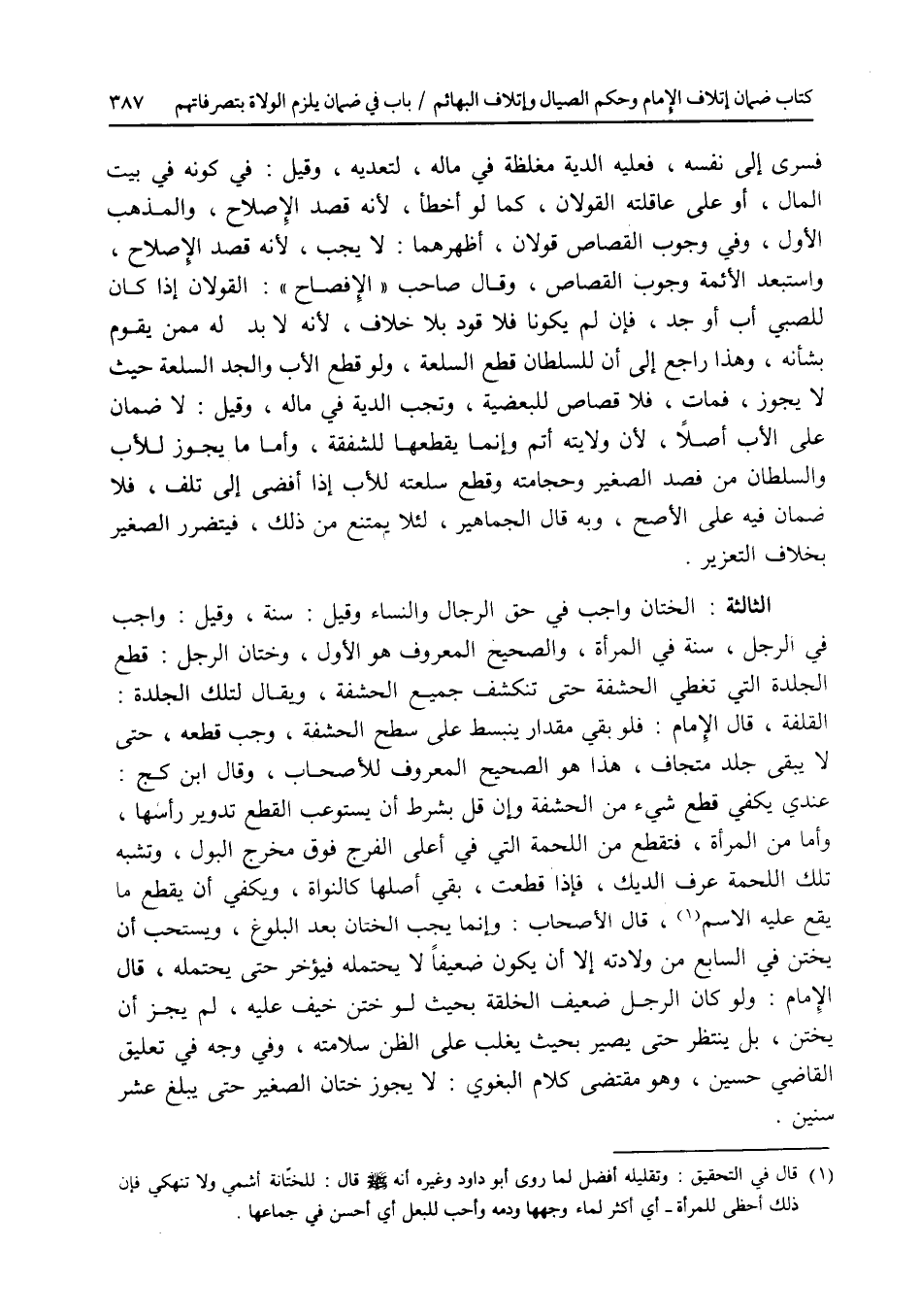 فسرى إلى نفسه، فعليه الدية مغلظة في ماله، لتعديه، وقيل: في كونه في بيت المال، أو على عاقلته القولان، كما لو أخطأ، لانه قصد الاصلاح، والمذهب الاول، وفي وجوب القصاص قولان، أظهرهما: لا يجب، لانه قصد الاصلاح، واستبعد الائمة وجوب القصاص، وقال صاحب الافصاح: القولان إذا كان للصبي أب أو جد، فإن لم يكونا فلا قود بلا خلاف، لانه لا بد له ممن يقوم بشأنه، وهذا راجع إلى أن للسلطان قطع السلعة، ولو قطع الاب والجد السلعة حيث لا يجوز، فمات، فلا قصاص للبعضية، وتجب الدية في ماله، وقيل: لا ضمان على الاب أصلا، لان ولايته أتم وإنما يقطعها للشفقة، وأما ما يجوز للاب والسلطان من فصد الصغير وحجامته وقطع سلعته للاب إذا أفضى إلى تلف، فلا ضمان فيه على الاصح، وبه قال الجماهير، لئلا يمتنع من ذلك، فيتضرر الصغير بخلاف التعزير. الثالثة: الختان واجب في حق الرجال والنساء، وقيل: سنة، وقيل: واجب في الرجل، سنة في المرأة، والصحيح المعروف هو الاول، وختان الرجل: قطع الجلدة التي تغطي الحشفة حتى تنكشف جميع الحشفة، ويقال لتلك الجلدة: القلفة، قال الامام: فلو بقي مقدار ينبسط على سطح الحشفة، وجب قطعه، حتى لا يبقى جلد متجاف، هذا هو الصحيح المعروف للاصحاب، وقال ابن كج: عندي يكفي قطع شئ من الحشفة وإن قل بشرط أن يستوعب القطع تدوير رأسها، وأما من المرأة، فتقطع من اللحمة التي في أعلق الفرج فوق مخرج البول، وتشبه تلك اللحمة عرف الديك، فإذا قطعت، بقي أصلها كالنواة، ويكفي أن يقطع ما يقع عليه الاسم، قال الاصحاب: وإنما يجب الختان بعد البلوغ، ويستحب أن يختن في السابع من ولادته إلا أن يكون ضعيفا لا يحتمله فيؤخر حتى يحتمله، قال الامام: ولو كان الرجل ضعيف الخلقة بحيث لو ختن خيف عليه، لم يجز أن يختن، بل ينتظر حتى يصير بحيث يغلب على الظن سلامته، وفي وجه في تعليق القاضي حسين، وهو مقتضى كلام البغوي: لا يجوز ختان الصغير حتى يبلغ عشر سنين.