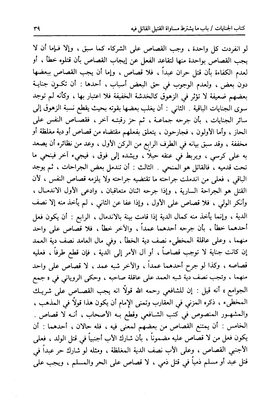 لو انفردت كل واحدة، وجب القصاص على الشركاء كما سبق، وإلا فإما أن لا يجب القصاص بواحدة منها لتقاعد الفعل عن إيجاب القصاص بأن قتلوه خطأ، أو لعدم الكفاءة بأن قتل حران عبدا، فلا قصاص، وإما أن يجب القصاص ببعضها دون بعض، ولعدم الوجوب في حق البعض أسباب، أحدها: أن تكون جناية بعضهم ضعيفة لا تؤثر في الزهوق كالخدشة الخفيفة فلا اعتبار بها، وكأنه لم توجد سوى الجنايات الباقية. الثاني: أن يغلب بعضها بقوته بحيث يقطع نسبة الزهوق إلى سائر الجنايات، بأن جرحه جماعة، ثم حز رقبته آخر، فقصاص النفس على الحاز، وأما الاولون، فجارحون، يتعلق بفعلهم مقتضاه من قصاص أو دية مغلظة أو مخففة، وقد سبق بيانه في الطرف الرابع من الركن الاول، وعد من نظائره أن يصعد به على كرسي، ويربط في عنقه حبلا، ويشده إلى فوق، فيجئ آخر فينحي ما تحت قدميه، فالقاتل هو المنحي. الثالث: أن تندمل بعض الجراحات، ثم يوجد الباقي، فعلى من اندملت جراحته ما تقتضيه جراحته ولا يلزمه قصاص النفس، لان القتل هو الجراحة السارية، وإذا جرحه اثنان متعاقبان، وادعى الاول الاندمال، وأنكر الولي، فلا قصاص على الاول، وإذا عفا عن الثاني، لم يأخذ منه إلا نصف الدية، وإنما يأخذ منه كمال الدية إذا قامت بينة بالاندمال، الرابع: أن يكون فعل أحدهما خطأ، بأن جرحه أحدهما عمدا، والآخر خطأ، فلا قصاص على واحد منهما، وعلى عاقلة المخطئ نصف دية الخطأ، وفي مال العامد نصف دية العمد إن كانت جناية لا توجب قصاصا، أو آل الامر إلى الدية، فإن قطع طرفا، فعليه قصاصه، وكذا لو جرح أحدهما عمدا، والآخر شبه عمد، لا قصاص على واحد منهما، وتجب نصف دية شبه العمد على عاقلة صاحبه، وحكى الروياني في جمع الجوامع أنه قيل: إن للشافعي رحمه الله قولا أنه يجب القصاص على شريك المخطئ، ذكره المزني في العقارب وتمنى الامام أن يكون هذا قولا في المذهب، والمشهور المنصوص في كتب ] الشافعي وقطع به الاصحاب، أنه لا قصاص. الخامس: أن يمتنع القصاص من بعضهم لمعنى فيه، فله حالان، أحدهما: أن يكون فعل من لا قصاص عليه مضمونا، بأن شارك الاب أجنبيا في قتل الولد، فعلى الاجنبي القصاص، وعلى الاب نصف الدية المغلظة، ومثله لو شارك حر عبدا في قتل عبد أو مسلم ذميا في قتل ذمي، لا قصاص على الحر والمسلم، ويجب على