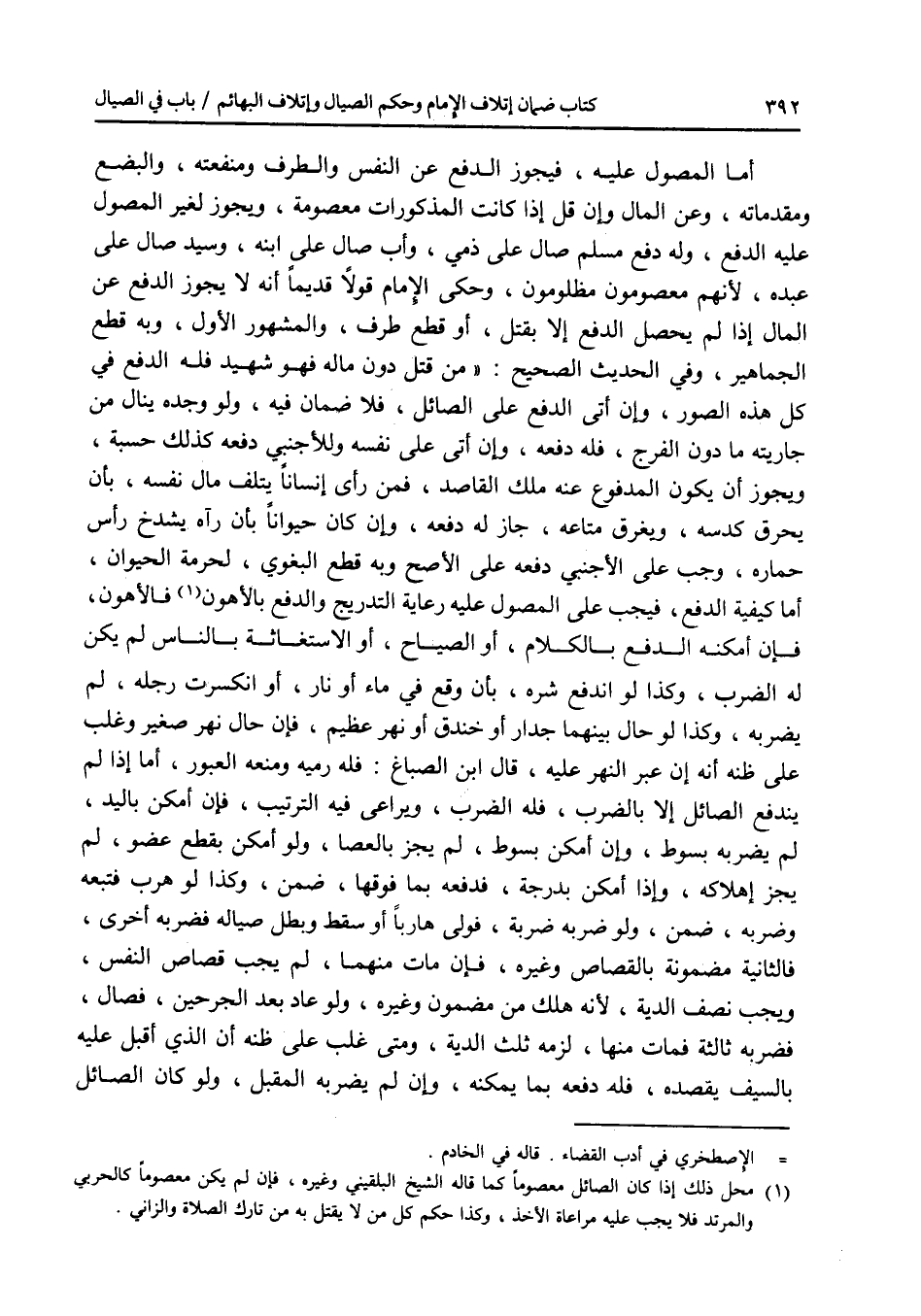 أما المصول عليه، فيجوز الدفع عن النفس والطرف ومنفعته، والبضع ومقدماته، وعن المال وإن قل إذا كانت المذكورات معصومة، ويجوز لغير المصول عليه الدفع، وله دفع مسلم صال على ذمي، وأب صال على ابنه، وسيد صال على عبده، لانهم معصومون مظلومون، وحكى الامام قولا قديما أنه لا يجوز الدفع عن المال إذا لم يحصل الدفع إلا بقتل، أو قطع طرف، والمشهور الاول، وبه قطع الجماهير، وفي الحديث الصحيح: من قتل دون ماله فهو شهيد فله الدفع في كل هذه الصور، وإن أتى الدفع على الصائل، فلا ضمان فيه، ولو وجده ينال من جاريته ما دون الفرج، فله دفعه، وإن أتى على نفسه وللاجنبي دفعه كذلك حسبة، ويجوز أن يكون المدفوع عنه ملك القاصد، فمن رأى إنسانا يتلف مال نفسه، بأن يحرق كدسه، ويغرق متاعه، جاز له دفعه، وإن كان حيوانا بأن رآه يشدخ رأس حماره، وجب على الاجنبي دفعه على الاصح وبه قطع البغوي، لحرمة الحيوان، أما كيفية الدفع، فيجب على المصول عليه رعاية التدريج والدفع بالاهون فالاهون، فإن أمكنه الدفع بالكلام، أو الصياح، أو الاستغاثة بالناس، لم يكن له الضرب، وكذا لو اندفع شره، بأن وقع في ماء أو نار، أو انكسرت رجله، لم يضربه، وكذا لو حال بينهما جدار أو خندق أو نهر عظيم، فإن حال نهر صغير وغلب على ظنه أنه إن عبر النهر عليه، قال ابن الصباغ: فله رميه ومنعه العبور، أما إذا لم يندفع الصائل إلا بالضرب، فله الضرب، ويراعى فيه الترتيب، فإن أمكن باليد، لم يضربه بسوط، وإن أمكن بسوط، لم يجز بالعصا، ولو أمكن بقطع عضو، لم يجز إهلاكه، وإذا أمكن بدرجة، فدفعه بما فوقها، ضمن، وكذا لو هرب فتبعه وضربه، ضمن، ولو ضربه ضربة، فولى هاربا أو سقط، وبطل صياله فضربه أخرى، فالثانية مضمونة بالقصاص وغيره، فإن مات منهما، لم يجب قصاص النفس، ويجب نصف الدية، لانه هلك من مضمون وغيره، ولو عاد بعد الجرحين، فصال، فضربه ثالثة فمات منها، لزمه ثلث الدية، ومتى غلب على ظنه أن الذي أقبل عليه بالسيف يقصده، فله دفعه بما يمكنه، وإن لم يضربه المقبل، ولو كان الصائل