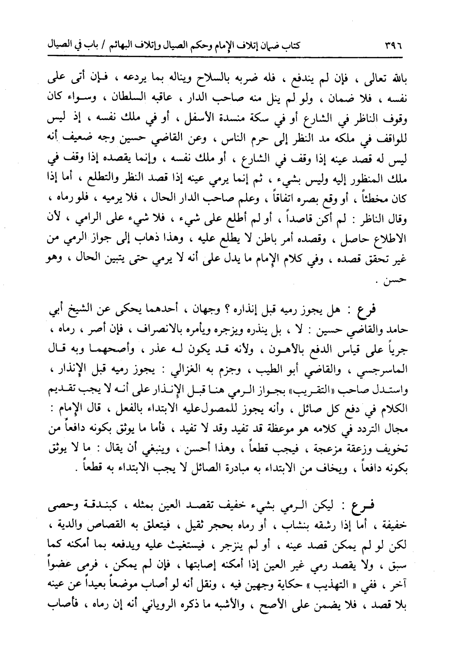 بالله تعالى، فإن لم يندفع، فله ضربه بالسلاح ويناله بما يردعه، فإن أتى على نفسه، فلا ضمان، ولو لم ينل منه صاحب الدار، عاقبه السلطان، وسواء كان وقوف الناظر في الشارع أو في سكة منسدة الاسفل، أو في ملك نفسه، إذ ليس للواقف في ملكه مد النظر إلى حرم الناس، وعن القاضي حسين وجه ضعيف أنه ليس له قصد عينه إذا وقف في الشارع، أو ملك نفسه، وإنما يقصده إذا وقف في ملك المنظور إليه وليس بشئ، ثم إنما يرمي عينه إذا قصد النظر والتطلع، أما إذا كان مخطئا، أو وقع بصره اتفاقا، وعلم صاحب الدار الحال، فلا يرميه، فلو رماه، وقال الناظر: لم أكن قاصدا، أو لم أطلع على شئ، فلا شئ على الرامي، لان الاطلاع حاصل، وقصده أمر باطن لا يطلع عليه، وهذا ذهاب إلى جواز الرمي من غير تحقق قصده، وفي كلام الامام ما يدل على أنه لا يرمي حتى يتبين الحال، وهو حسن. فرع هل يجوز رميه قبل إنذاره ؟ وجهان، أحدهما يحكى عن الشيخ أبي حامد والقاضي حسين: لا، بل ينذره ويزجره ويأمره بالانصراف، فإن أصر، رماه، جريا على قياس الدفع بالاهون، ولانه قد يكون له عذر، وأصحهما وبه قال الماسرجسي، والقاضي أبو الطيب، وجزم به الغزالي: يجوز رميه قبل الانذار، واستدل صاحب التقريب بجواز الرمي هنا قبل الانذار على أنه لا يجب تقديم الكلام في دفع كل صائل، وأنه يجوز للمصول عليه الابتداء بالفعل، قال الامام: مجال التردد في كلامه هو موعظة قد تفيد وقد لا تفيد، فأما ما يوثق بكونه دافعا من تخويف وزعقة مزعجة، فيجب قطعا، وهذا أحسن، وينبغي أن يقال: ما لا يوثق بكونه دافعا، ويخاف من الابتداء به مبادرة الصائل لا يجب الابتداء به قطعا. فرع ليكن الرمي بشئ خفيف تقصد العين بمثله، كبندقة وحصى خفيفة، أما إذا رشقه بنشاب، أو رماه بحجر ثقيل، فيتعلق به القصاص والدية، لكن لو لم يمكن قصد عينه، أو لم ينزجر، فيستغيث عليه ويدفعه بما أمكنه كما سبق، ولا يقصد رمي غير العين إذا أمكنه إصابتها، فإن لم يمكن، فرمى عضوا آخر، ففي التهذيب حكاية وجهين فيه، ونقل أنه لو أصاب موضعا بعيدا عن عينه بلا قصد، فلا يضمن على الاصح، والاشبه ما ذكره الروياني أنه إن رماه، فأصاب