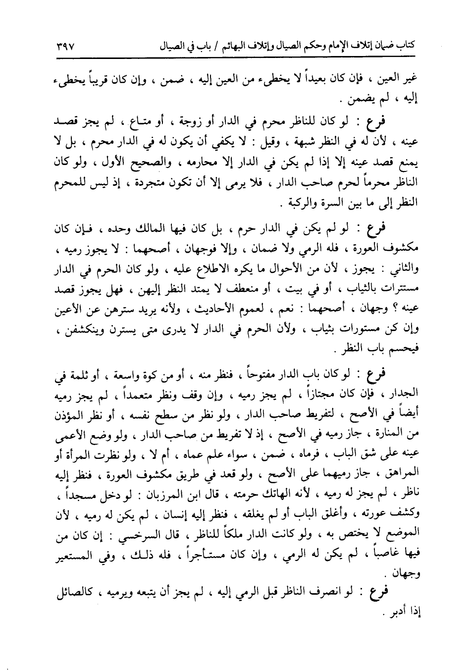 غير العين، فإن كان بعيدا لا يخطئ من العين إليه، ضمن، وإن كان قريبا يخطئ إليه، لم يضمن. فرع لو كان للناظر محرم في الدار، أو زوجة، أو متاع، لم يجز قصد عينه، لان له في النظر شبهة، وقيل: لا يكفي أن يكون له في الدار محرم، بل لا يمنع قصد عينه إلا إذا لم يكن في الدار إلا محارمه، والصحيح الاول، ولو كان الناظر محرما لحرم صاحب الدار، فلا يرمى إلا أن تكون متجردة، إذا ليس للمحرم النظر إلى ما بين السرة والركبة. فرع لو لم يكن في الدار حرم، بل كان فيها المالك وحده، فإن كان مكشوف العورة، فله الرمي ولا ضمان، وإلا فوجهان، أصحهما: لا يجوز رميه، والثاني: يجوز، لان من الاحوال ما يكره الاطلاع عليه، ولو كان الحرم في الدار مستترات بالثياب، أو في بيت، أو منعطف لا يمتد النظر إليهن، فهل يجوز قصد عينه ؟ وجهان، أصحهما: نعم، لعموم الاحاديث، ولانه يريد سترهن عن الاعين وإن كن مستورات بثياب، ولان الحرم في الدار لا يدرى متى يسترن وينكشفن، فيحسم باب النظر. فرع لو كان باب الدار مفتوحا، فنظر منه، أو من كوة واسعة، أو ثلمة في الجدار، فإن كان مجتازا، لم يجز رميه، وإن وقف ونظر متعمدا، لم يجز رميه أيضا في الاصح، لتفريط صاحب الدار، ولو نظر من سطح نفسه، أو نظر المؤذن من المنارة، جاز رميه في الاصح، إذ لا تفريط من صاحب الدار، ولو وضع الاعمى عينه على ضق الباب، فرماه، ضمن، سواء علم عماه، أم لا، ولو نظرت المرأة أو المراهق، جاز رميهما على الاصح، ولو قعد في طريق مكشوف العورة، فنظر إليه ناظر، لم يجز له رميه، لانه الهاتك حرمته، قال ابن المرزبان: لو دخل مسجدا، وكشف عورته، وأغلق الباب أو لم يغلقه، فنظر إليه إنسان، لم يكن له رميه، لان الموضع لا يختص به، ولو كانت الدار ملكا للناظر، قال السرخسي: إن كان من فيها غاصبا، لم يكن له الرمي، وإن كان مستأجرا، فله ذلك، وفي المستعير وجهان. فرع لو انصرف الناظر قبل الرمي إليه، لم يجز أن يتبعه ويرميه، كالصائل إذا أدبر.