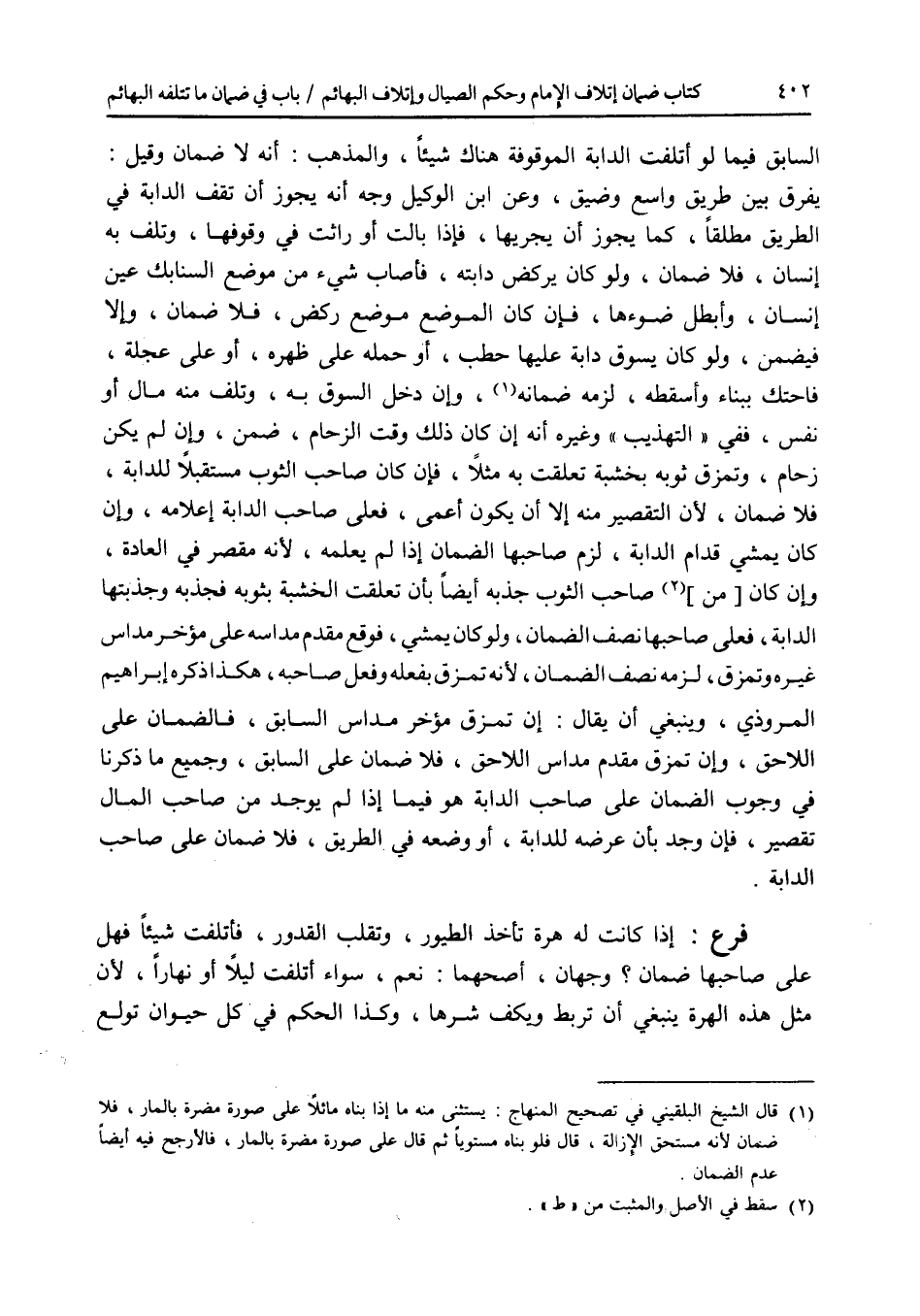 السابق فيما لو أتلفت الدابة الموقوفة هناك شيئا، والمذهب: أنه لا ضمان وقيل: يفرق بين طريق واسع وضيق، وعن ابن الوكيل وجه أنه يجوز أن تقف الدابة في الطريق مطلقا، كما يجوز أن يجريها، فإذا بالت أو راثت في وقوفها، وتلف به إنسان، فلا ضمان، ولو كان يركض دابته، فأصاب شئ من موضع السنابك عين إنسان، وأبطل ضوءها، فإن كان الموضع موضع ركض، فلا ضمان، وإلا فيضمن، ولو كان يسوق دابة عليها حطب، أو حمله عى ظهره، أو على عجلة، فاحتك ببناء وأسقطه، لزمه ضمانه، وإن دخل السوق به، وتلف منه مال أو نفس، ففي التهذيب وغيره أنه إن كان ذلك وقت الزحام، ضمن، وإن لم يكن زحام، وتمزق ثوبه بخشبة تعلقت به مثلا، فإن كان صاحب الثوب مستقبلا للدابة، فلا ضمان، لان التقصير منه إلا أن يكون أعمى، فعلى صاحب الدابة اعلامه، وإن كان يمشي قدام الدابة، لزم صاحبها الضمان إذا لم يعلمه، لانه مقصر في العادة، وإن كان من صاحب الثوب جذبه أيضا بأن تعلقت الخشبة بثوبه فجذبه وجذبتها الدابة، فعلى صاحبها نصف الضمان، ولو كان يمشي، فوقع مقدم مداسه على مؤخر مداس غيره وتمزق، لزمه نصف الضمان، لانه تمزق بفعله وفعل صاحبه، هكذا ذكره إبرهيم المروذي، وينبغي أن يقال: إن تمزق مؤخر مداس السابق، فالضمان على اللاحق، وإن تمزق مقدم مداس اللاحق، فلا ضمان على السابق، وجميع ما ذكرنا في وجوب الضمان على صاحب الدابة هو فيما إذا لم يوجد من صاحب المال تقصير، فإن وجد بأن عرضه للدابة، أو وضعه في الطريق، فلا ضمان على صاحب الدابة. فرع إذا كانت له هرة تأخذ الطيور، وتقلب القدور، فأتلفت شيئا فهل على صاحبها ضمان ؟ وجهان، أصحهما: نعم، سواء أتلفت ليلا أو نهارا، لان مثل هذه الهرة ينبغي أن تربط ويكف شرها، وكذا الحكم في كل حيوان تولع