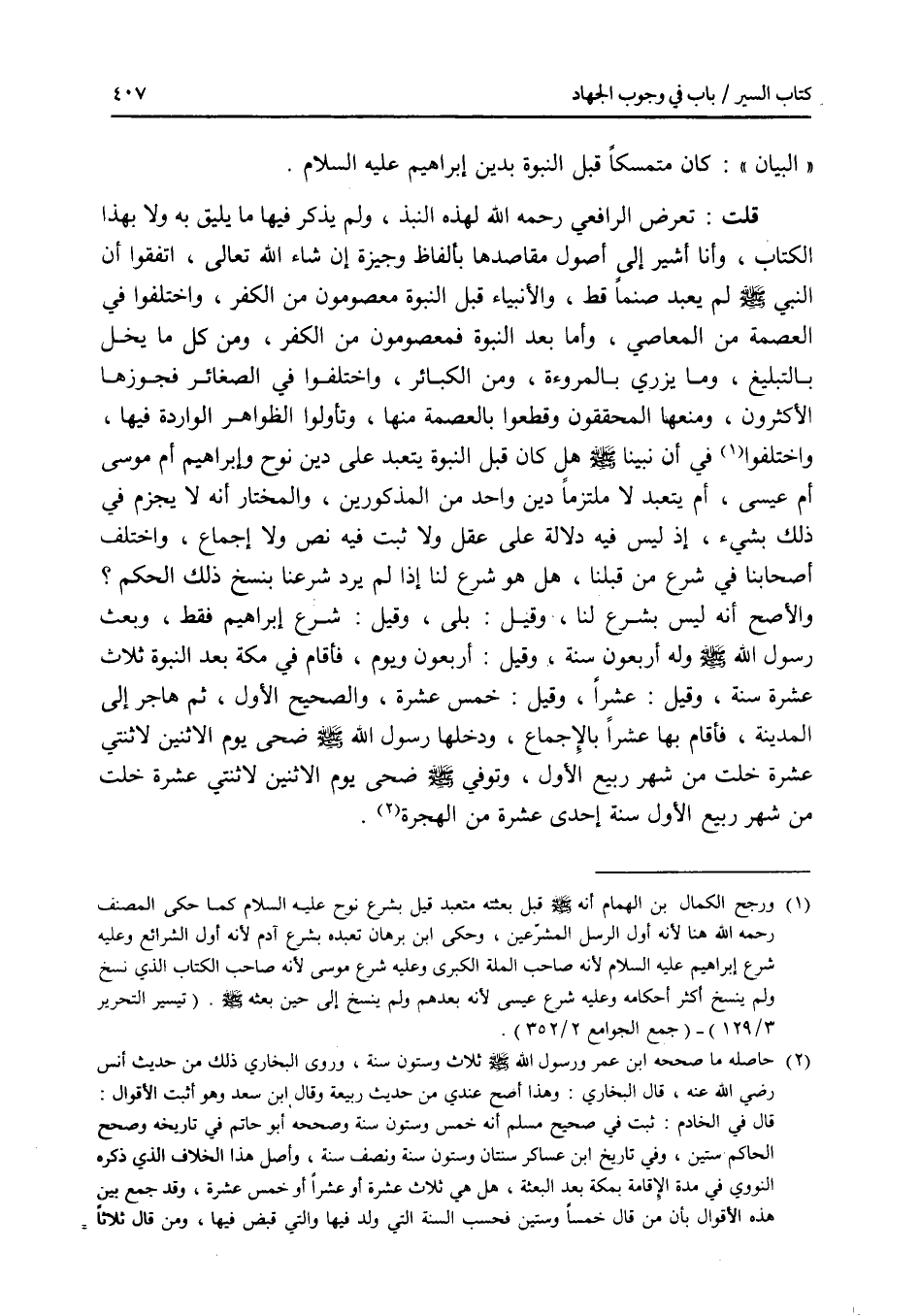 البيان: كان متمسكا قبل النبوة بدين إبرهيم - صلى الله عليه وسلم -. قلت: تعرض الرافعي رحمه الله لهذه النبذ، ولم يذكر فيها ما يليق به ولا بهذا الكتاب، وأنا أشير إلى أصول مقاصدها بألفاظ وجيزة إن شاء الله تعالى، اتفقوا أن النبي - صلى الله عليه وسلم - لم يعبد صنما قط، والانبياء قبل النبوة معصومون من الكفر، واختلفوا في العصمة من المعاصي، وأما بعد النبوة فمعصومون من الكفر، ومن كل ما يخل بالتبليغ، وما يزري بالمروءة، ومن الكبائر، واختلفوا في الصغائر فجوزها الاكثرون، ومنعها المحققون وقطعوا بالعصمة منها، وتأولوا الظواهر الواردة فيها، واختلفوا في أن نبينا - صلى الله عليه وسلم - هل كان قبل النبوة يتعبد على دين نوح وإبرهيم أم موسى أم عيسى، أم يتعبد لا ملتزما دين واحد من المذكورين، والمختار أنه لا يجزم في ذلك بشئ، إذ ليس فيه دلالة على عقل ولا ثبت فيه نص ولا إجماع، واختلف أصحابنا في شرع من قبلنا، هل هو شرع لنا إذا لم يرد شرعنا بنسخ ذلك الحكم ؟ والاصح أنه ليس بشرع لنا، وقيل: بلى، وقيل: شرع إبرهيم فقط، وبعث رسول الله - صلى الله عليه وسلم - وله أربعون سنة، وقيل: أربعون ويوم، فأقام في مكة بعد النبوة ثلاث عشرة سنة، وقيل: عشرا، وقيل: خمس عشرة، والصحيح الاول، ثم هاجر إلى المدينة، فأقام بها عشرا بالاجماع، ودخلها رسول الله - صلى الله عليه وسلم - ضحى يوم الاثنين لاثنتي عشرة خلت من شهر ربيع الاول، وتوفي - صلى الله عليه وسلم - ضحى يوم الاثنين لاثنتي عشرة خلت من شهر ربيع الاول سنة إحدى عشرة من الهجرة