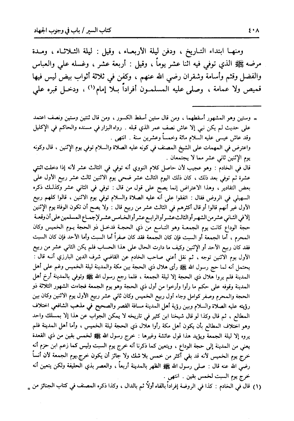 ومنها ابتداء التاريخ، ودفن ليلة الاربعاء، وقيل: ليلة الثلاثاء، ومدة مرضه - صلى الله عليه وسلم - الذي توفي فيه اثنا عشر يوما، وقيل: أربعة عشر، وغسله علي والعباس والفضل وقثم وأسامة وشقران رضي الله عنهم، وكفن في ثلاثة أثواب بيض ليس فيها قميص ولا عمامة، وصلى عليه المسلمون أفرادا، بلا إمام، ودخل قبره علي