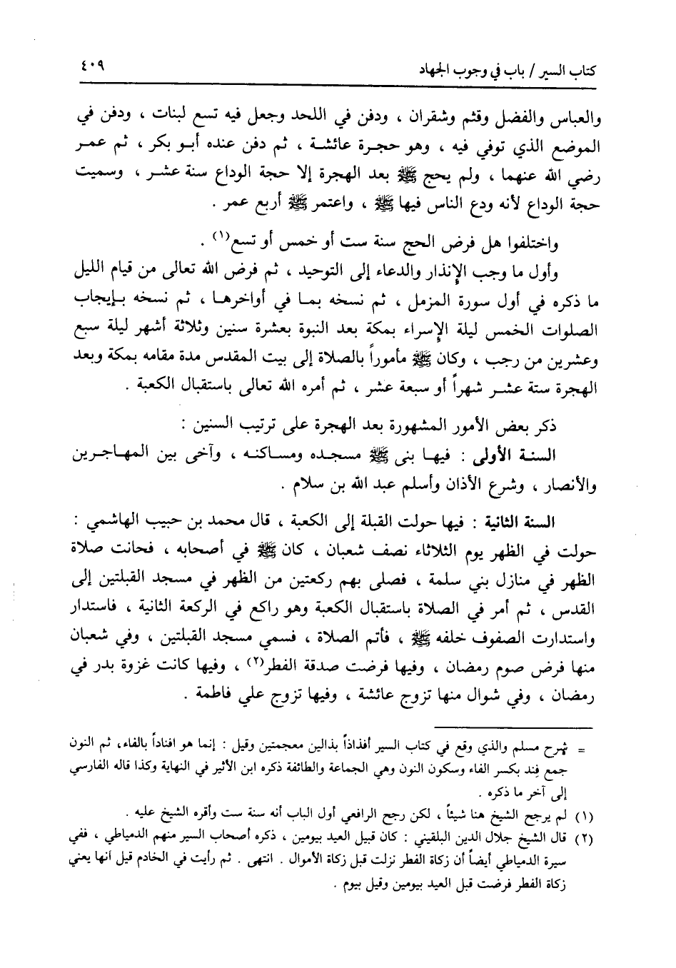 والعباس والفضل وقثم وشقران، ودفن في اللحد وجعل فيه تسع لبنات، ودفن في الموضع الذي توفي فيه، وهو حجرة عائشة، ثم دفن عنده أبو بكر، ثم عمر رضي الله عنهما، ولم يحج - صلى الله عليه وسلم - بعد الهجرة إلا حجة الوداع سنة عشر، وسميت حجة الوداع لانه ودع الناس فيها - صلى الله عليه وسلم -، واعتمر - صلى الله عليه وسلم - أربع عمر، واختلفوا هل فرض الحج سنة ست أو خمس أو تسع، وأول ما وجب الانذار والدعاء إلى التوحيد، ثم فرض الله تعالى من قيام الليل ما ذكره في أول سورة المزمل، ثم نسخه بما في أواخرها، ثم نسخه بإيجاب الصلوات الخمس ليلة الاسراء بمكة بعد النبوة بعشر سنين وثلاثة أشهر ليلة سبع وعشرين من رجب، وكان - صلى الله عليه وسلم - مأمورا بالصلاة إلى بيت المقدس مدة مقامه بمكة وبعد الهجرة ستة عشر شهرا أو سبعة عشر، ثم أمره الله تعالى باستقبال الكعبة. ذكر بعض الامور المشهورة بعد الهجرة على ترتيب السنين: السنة الاولى: فيها بنى - صلى الله عليه وسلم - مسجده ومساكنه، وآخى بين المهاجرين والانصار، وشرع الاذان وأسلم عبد الله بن سلام. السنة الثانية: فيها حولت القبلة إلى الكعبة، قال محمد بن حبيب الهاشمي: حولت في الظهر يوم الثلاثاء نصف شعبان، كان - صلى الله عليه وسلم - في أصحابه، فحانت صلاة الظهر في منازل بني سلمة، فصلى بهم ركعتين من الظهر في مسجد القبلتين إلى القدس، ثم أمر في الصلاة باستقبال الكعبة وهو راكع في الركعة الثانية، فاستدار واستدارت الصفوف خلفه - صلى الله عليه وسلم -، فأتم الصلاة، فسمي مسجد القبلتين، وفي شعبان منها فرض صوم رمضان، وفيها فرضت صدقة الفطر، وفيها كانت غزوة بدر في رمضان، وفي شوال منها تزوج عائشة، وفيها تزوج علي فاطمة.