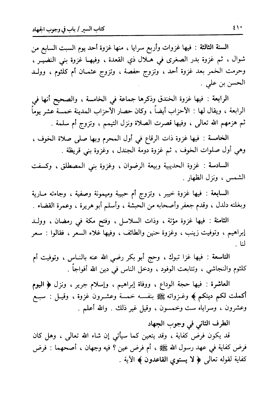 السنة الثالثة: فيها غزوات وأربع سرايا، منها غزوة أحد يوم السبت السابع من شوال، ثم غزوة بدر الصغرى في هلال ذي القعدة، وفيها غزوة بني النضير، وحرمت الخمر بعد غزوة أحد، وتزوج حفصة، وتزوج عثمان أم كلثوم، وولد الحسن بن علي. الرابعة: فيها غزوة الخندق وذكرها جماعة في الخامسة، والصحيح أنها في الرابعة، ويقال لها: الاحزاب أيضا، وكان حصار الاحزاب المدينة خمسة عشر يوما ثم هزمهم الله تعالى، وفيها قصرت الصلاة ونزل التيمم، وتزوج أم سلمة. الخامسة: فيها غزوة ذات الرقاع في أول المحرم وبها صلى صلاة الخوف، وهي أول صلوات الخوف، ثم غزوة دومة الجندل، وغزوة بني قريظة. السادسة: غزوة الحديبية وبيعة الرضوان، وغزوة بني المصطلق، وكسفت الشمس، ونزل الظهار. السابعة: فيها غزوة خيبر، وتزوج أم حبيبة وميمونة وصفية، وجاءته مارية وبغلته دلدل، وقدم جعفر وأصحابه من الحبشة، وأسلم أبو هريرة، وعمرة القضاء. الثامنة: فيها غزوة مؤتة، وذات السلاسل، وفتح مكة في رمضان، وولد إبرهيم، وتوفيت زينب، وغزوة حنين والطائف، وفيها غلاء السعر، فقالوا: سعر لنا. التاسعة: فيها غزا تبوك، وحج أبو بكر رضي الله عنه بالناس، وتوفيت أم كلثوم والنجاشي، وتتابعت الوفود، ودخل الناس في دين الله أفواجا. العاشرة: فيها حجة الوداع، ووفاة إبرهيم، وإسلام جرير، ونزل اليوم أكملت لكم دينكم وغزواته - صلى الله عليه وسلم - بنفسه خمسة وعشرون غزوة، وقيل: سبع وعشرون، وسراياه ست وخمسون، وقيل غير ذلك. والله أعلم.