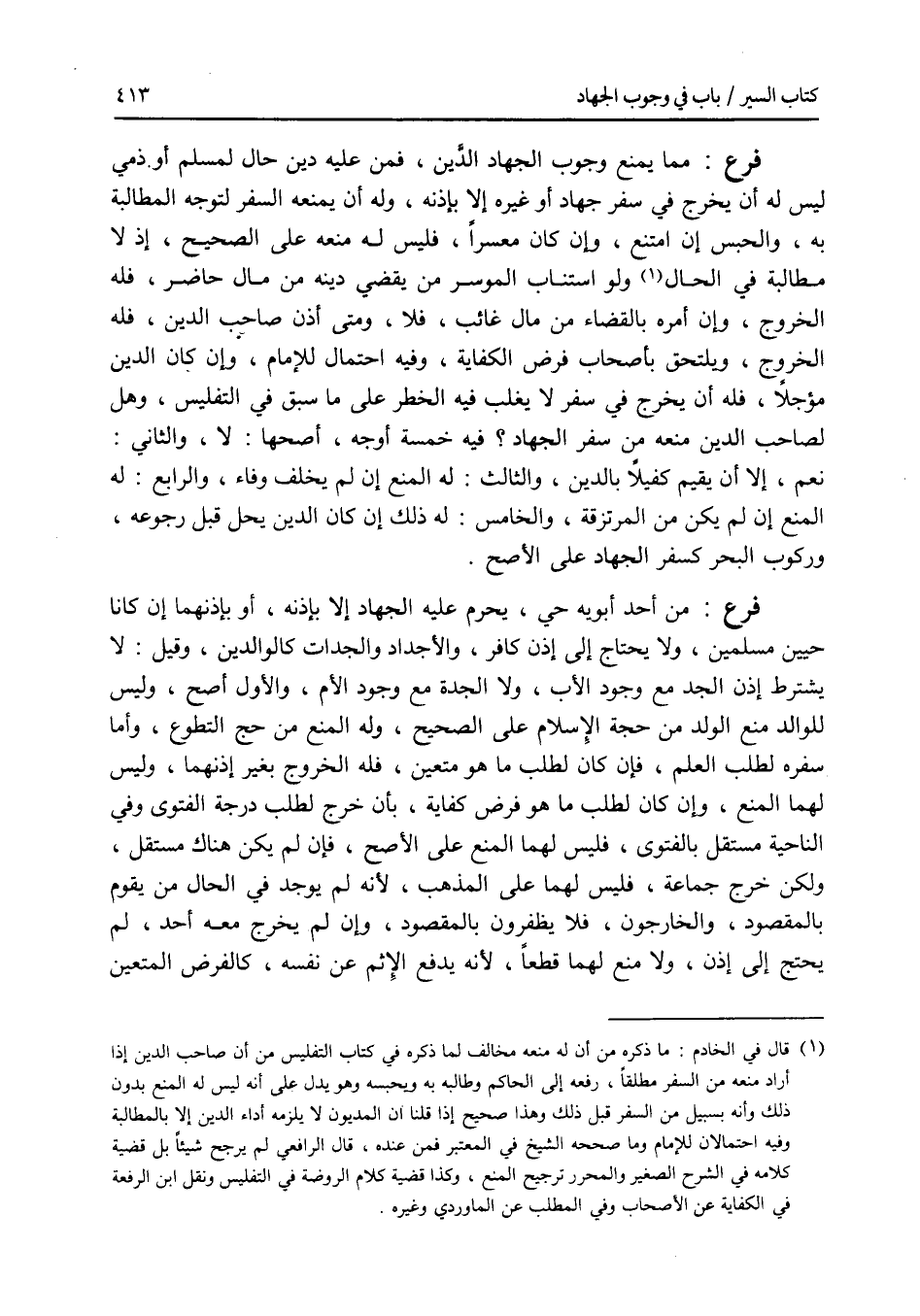 فرع مما يمنع وجوب الجهاد الدين، فمن عليه دين حال لمسلم أو ذمي ليس له أن يخرج في سفر جهاد أو غيره إلا بإذنه، وله أن يمنعه السفر لتوجه المطالبة به، والحبس إن امتنع، وإن كان معسرا، فليس له منعه على الصحيح، إذ لا مطالبة في الحال، ولو استناب الموسر من يقضي دينه من مال حاضر، فله الخروج، وإن أمره بالقضاء من مال غائب، فلا، ومتى أذن صاحب الدين، فله الخروج، ويلتحق بأصحاب فرض الكفاية، وفيه احتمال للامام، وإن كان الدين مؤجلا، فله أن يخرج في سفر لا يغلب فيه الخطر على ما سبق في التفليس، وهل لصاحب الدين منعه من سفر الجهاد ؟ فيه خمسة أوجه، أصحها: لا، والثاني: نعم، إلا أن يقيم كفيلا بالدين، والثالث: له المنع إن لم يخلف وفاء، والرابع: له المنع إن لم يكن من المرتزقة، والخامس: له ذلك إن كان الدين يحل قبل رجوعه، وركوب البحر كسفر الجهاد على الاصح. فرع من أحد أبويه حي، يحرم عليه الجهاد إلا بإذنه، أو بإذنهما إن كانا حيين مسلمين، ولا يحتاج إلى إذن كافر، والاجداد والجدات كالوالدين، وقيل: لا يشترط إذن الجد مع وجود الاب، ولا الجدة مع وجود الام، والاول أصح، وليس للوالد منع الولد من حجة الاسلام على الصحيح، وله المنع من حج التطوع، وأما سفره لطلب العلم، فإن كان لطلب ما هو متعين، فله الخروج بغير إذنهما، وليس لهما المنع، وإن كان لطلب ما هو فرض كفاية، بأن خرج لطلب درجة الفتوى في الناحية مستقل بالفتوى، فليس لهما المنع على الاصح، فإن لم يكن هناك مستقل، ولكن خرج جماعة، فليس لهما على المذهب، لانه لم يوجد في الحال من يقوم بالمقصود، والخارجون، فلا يظفرون بالمقصود، وإن لم يخرج معه أحد، لم يحتج إلى إذن، ولا منع لهما قطعا، لانه يدفع الاثم عن نفسه، كالفرض المتعين