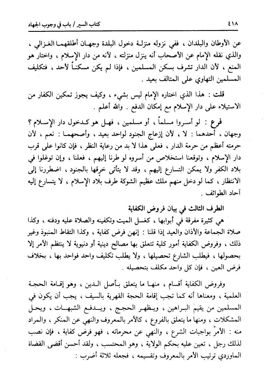 هي كثيرة مفرقة في أبوابها، كغسل الميت وتكفينه والصلاة عليه ودفنه، وكذا صلاة الجماعة والاذان والعيد إذا قلنا: إنهن فرض كفاية، وكذا التقاط المنبوذ وغير ذلك، وفروض الكفاية أمور كلية تتعلق بها مصالح دينية أو دنيوية لا ينتظم الامر إلا بحصولها، فيطلب الشارع تحصيلها، ولا يطلب تكليف واحد فواحد بها، بخلاف فرض العين، فإن كل واحد مكلف بتحصيله، وفروض الكفاية أقسام، منها ما يتعلق بأصل الدين، وهو إقامة الحجة العلمية، ومعناها أنه كما تجب إقامة الحجة القهرية بالسيف، يجب أن يكون في المسلمين من يقيم البراهين، ويظهر الحجج، ويدفع الشبهات، ويحل المشكلات، ومنها ما يتعلق بالفروع، كالأمر بالمعروف والنهي عن المنكر، والمراد منه : الأمر بواجبات الشرع، والنهي عن محرماته، فهو فرض كفاية، فإن نصب لذلك رجل، تعين عليه بحكم الولاية، وهو المحتسب، ولقد أحسن أقضى القضاة الماوردي ترتيب الامر بالمعروف وتقسيمه، فجعله ثلاثة أضرب: