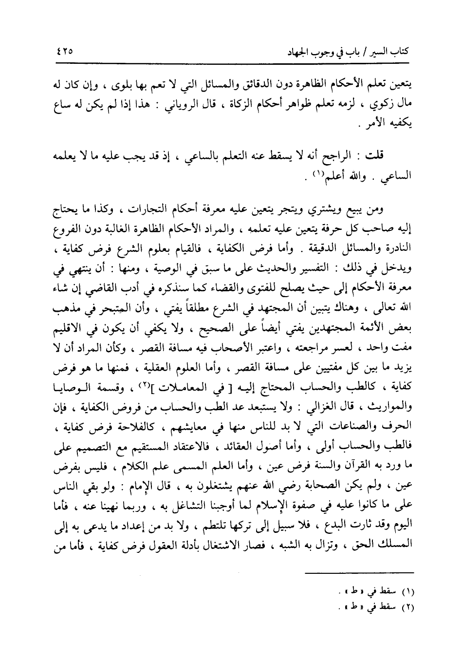 يتعين تعلم الاحكام الظاهرة دون الدقائق والمسائل التي لا تعم بها بلوى، وإن كان له مال زكوي، لزمه تعلم ظواهر أحكام الزكاة، قال الروياني: هذا إذا لم يكن له ساع يكفيه الامر. قلت: الراجح أنه لا يسقط عنه التعلم بالساعي، إذ قد يجب عليه ما لا يعلمه الساعي. والله أعلم. ومن يبيع ويشتري ويتجر يتعين عليه معرفة أحكام التجارات، وكذا ما يحتاج إليه صاحب كل حرفة يتعين عليه تعلمه، والمراد الاحكام الظاهرة الغالبة دون الفروع النادرة والمسائل الدقيقة. وأما فرض الكفاية، فالقيام بعلوم الشرع فرض كفاية ويدخل في ذلك: التفسير والحديث على ما سبق في الوصية، ومنها: أن ينتهي في معرفة الاحكام إلى حيث يصلح للفتوى والقضاء كما سنذكره في أدب القاضي إن شاء الله تعالى، وهناك يتبين أن المجتهد في الشرع مطلقا يفتي، وأن المتبحر في مذهب بعض الائمة المجتهدين يفتي أيضا على الصحيح، ولا يكفي أن يكون في الاقليم مفت واحد، لعسر مراجعته، واعتبر الاصحاب فيه مسافة القصر، وكأن المراد أن لا يزيد ما بين كل مفتيين على مسافة القصر، وأما العلوم العقلية، فمنها ما هو فرض كفاية، كالطب والحساب المحتاج إليه، وقسمة الوصايا والمواريث، قال الغزالي: ولا يستبعد عد الطب والحساب من فروض الكفاية، فإن الحرف والصناعات التي لا بد للناس منها في معايشهم، كالفلاحة فرض كفاية، فالطب والحساب أولى، وأما أصول العقائد، فالاعتقاد المستقيم مع التصميم على ما ورد به القرآن والسنة فرض عين، وأما العلم المسمى علم الكلام، فليس بفرض عين، ولم يكن الصحابة رضي الله عنهم يشتغلون به، قال الامام: ولو بقي الناس على ما كانوا عليه في صفوة الاسلام لما أوجبنا التشاغل به، وربما نهينا عنه، فأما اليوم وقد ثارت البدع، فلا سبيل إلى تركها تلتطم، ولا بد من إعداد ما يدعى به إلى المسلك الحق، وتزال به الشبه، فصار الاشتغال بأدلة العقول فرض كفاية، فأما من