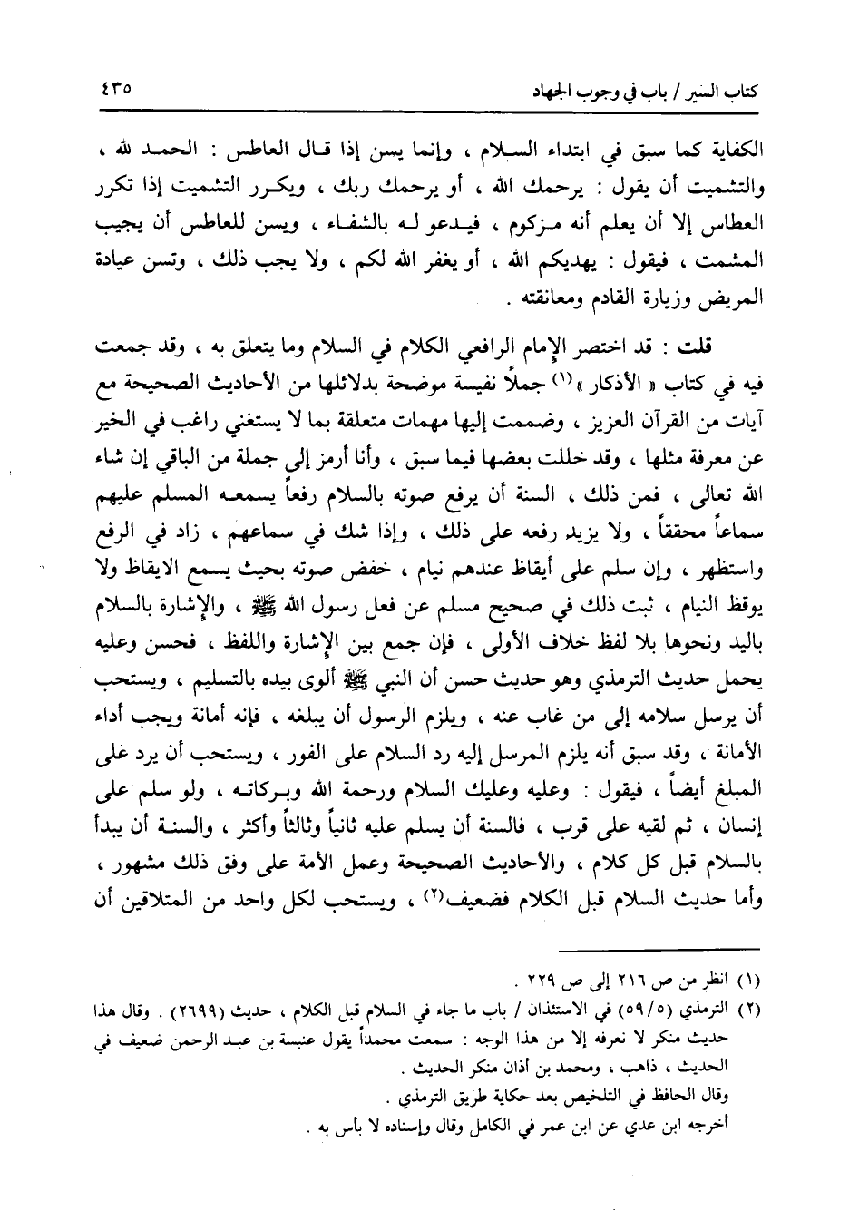 الكفاية كما سبق في ابتداء السلام، وإنما يسن إذا قال العاطس: الحمد لله، والتشميت أن يقول: يرحمك الله، أو يرحمك ربك، ويكرر التشميت إذا تكرر العطاس إلا أن يعلم أنه مزكوم، فيدعو له بالشفاء، ويسن للعاطس أن يجيب المشمت، فيقول: يهديكم الله، أو يغفر الله لكم، ولا يجب ذلك، وتسن عيادة المريض وزيارة القادم ومعانقته. قلت: قد اختصر الامام الرافعي الكلام في السلام وما يتعلق به، وقد جمعت فيه في كتاب الاذكار جملا نفيسة موضحة بدلائلها من الاحاديث الصحيحة مع آيات من القرآن العزيز، وضممت إليها مهمات متعلقة بما لا يستغني راغب في الخير عن معرفة مثلها، وقد خللت بعضها فيما سبق، وأنا أرمز إلى جملة من الباقي إن شاء الله تعالى، فمن ذلك، السنة أن يرفع صوته بالسلام رفعا يسمعه المسلم عليهم سماعا محققا، ولا يزيد رفعه على ذلك، وإذا شك في سماعهم، زاد في الرفع واستظهر، وإن سلم على أيقاظ عندهم نيام، خفض صوته بحيث يسمع الايقاظ ولا يوقظ النيام، ثبت ذلك في صحيح مسلم عن فعل رسول الله - صلى الله عليه وسلم -، والاشارة بالسلام باليد ونحوها بلا لفظ خلاف الاولى، فإن جمع بين الاشارة واللفظ، فحسن وعليه يحمل حديث الترمذي وهو حديث حسن أن النبي - صلى الله عليه وسلم - ألوى بيده بالتسليم، ويستحب أن يرسل سلامه إلى من غاب عنه، ويلزم الرسول أن يبلغه، فإنه أمانة ويجب أداء الامانة، وقد سبق أنه يلزم المرسل إليه رد السلام على الفور، ويستحب أن يرد على المبلغ أيضا، فيقول: وعليه وعليك السلام ورحمه الله وبركاته، ولو سلم على إنسان، ثم لقيه على قرب، فالسنة أن يسلم عليه ثانيا وثالثا وأكثر، والسنة أن يبدأ بالسلام قبل كل كلام، والاحاديث الصحيحة وعمل الامة على وفق ذلك مشهور، وأما حديث السلام قبل الكلام فضعيف، ويستحب لكل واحد من المتلاقين أن