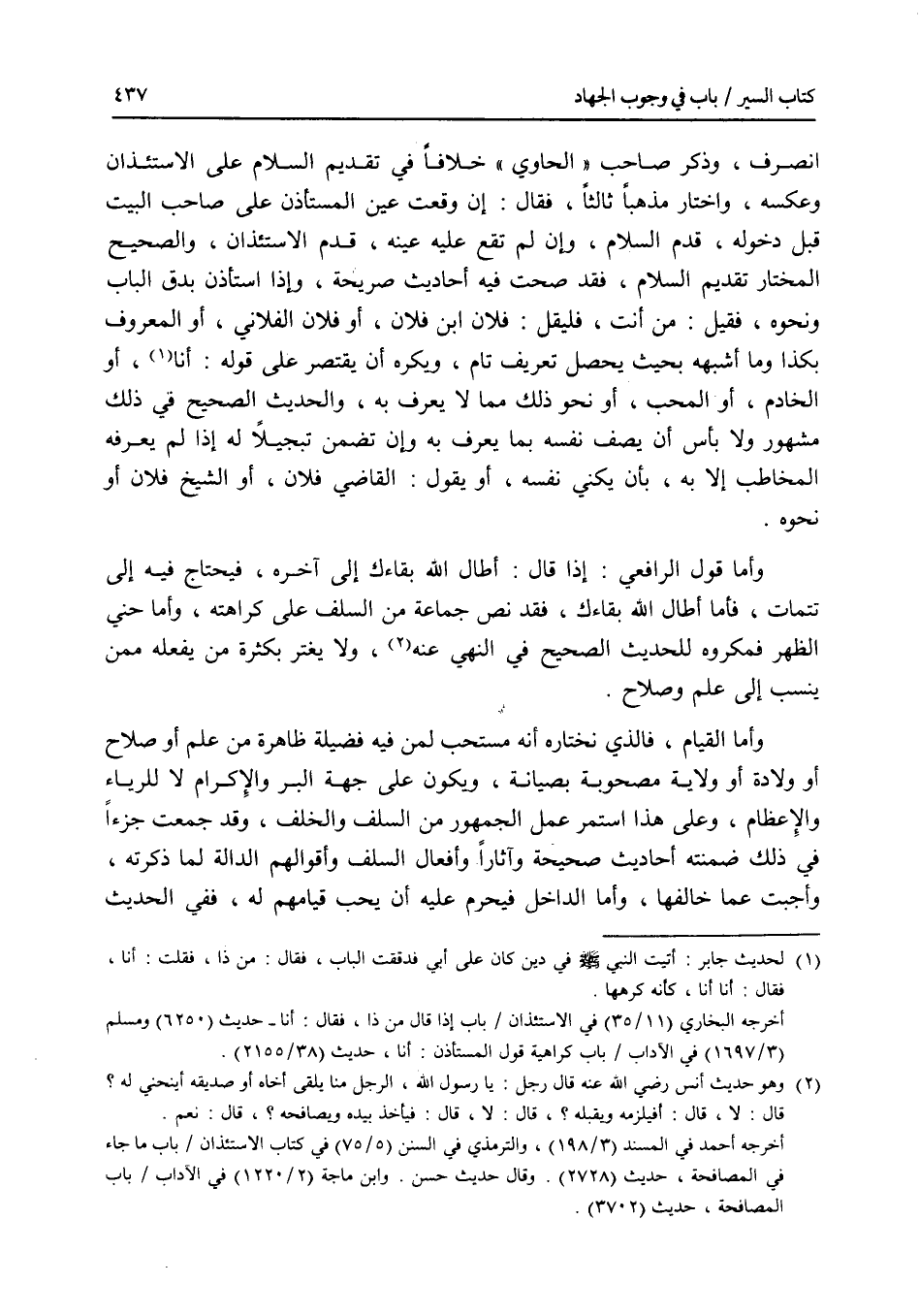 انصرف، وذكر صاحب الحاوي خلافا في تقديم السلام على الاستئذان وعكسه، واختار مذهبا ثالثا، فقال: إن وقعت عين المستأذن على صاحب البيت قبل دخوله، قدم السلام، وإن لم تقع عليه عينه، قدم الاستئذان، والصحيح المختار تقديم السلام، فقد صحت فيه أحاديث صريحة، وإذا استأذن بدق الباب ونحوه، فقيل: من أنت، فليقل: فلان ابن فلان، أو فلان الفلاني، أو المعروف بكذا وما أشبهه بحيث يحصل تعريف تام، ويكره أن يقتصر على قوله: أنا، أو الخادم، أو المحب، أو نحو ذلك مما لا يعرف به، والحديث الصحيح في ذلك مشهور، ولا بأس أن يصف نفسه بما يعرف به وإن تضمن تبجيلا له إذا لم يعرفه المخاطب إلا به، بأن يكني نفسه، أو يقول: القاضي فلان، أو الشيخ فلان أو نحوه. وأما قول الرافعي: إذا قال: أطال الله بقاءك إلى آخره، فيحتاج فيه إلى تتمات، فأما أطال الله بقاءك، فقد نص جماعة من السلف على كراهته، وأما حني الظهر فمكروه للحديث الصحيح في النهي عنه، ولا يغتر بكثرة من يفعله ممن ينسب إلى علم وصلاح. وأما القيام، فالذي نختاره أنه مستحب لمن فيه فضيلة ظاهرة من علم أو صلاح أو ولادة أو ولاية مصحوبة بصيانة، ويكون على جهة البر والاكرام لا للرياء والاعظام، وعلى هذا استمر عمل الجمهور من السلف والخلف، وقد جمعت جزءا في ذلك ضمنته أحاديث صحيحة وآثارا وأفعال السلف وأقوالهم الدالة لما ذكرته، وأجبت عما خالفها، وأما الداخل فيحرم عليه أن يحب قيامهم له، ففي الحديث